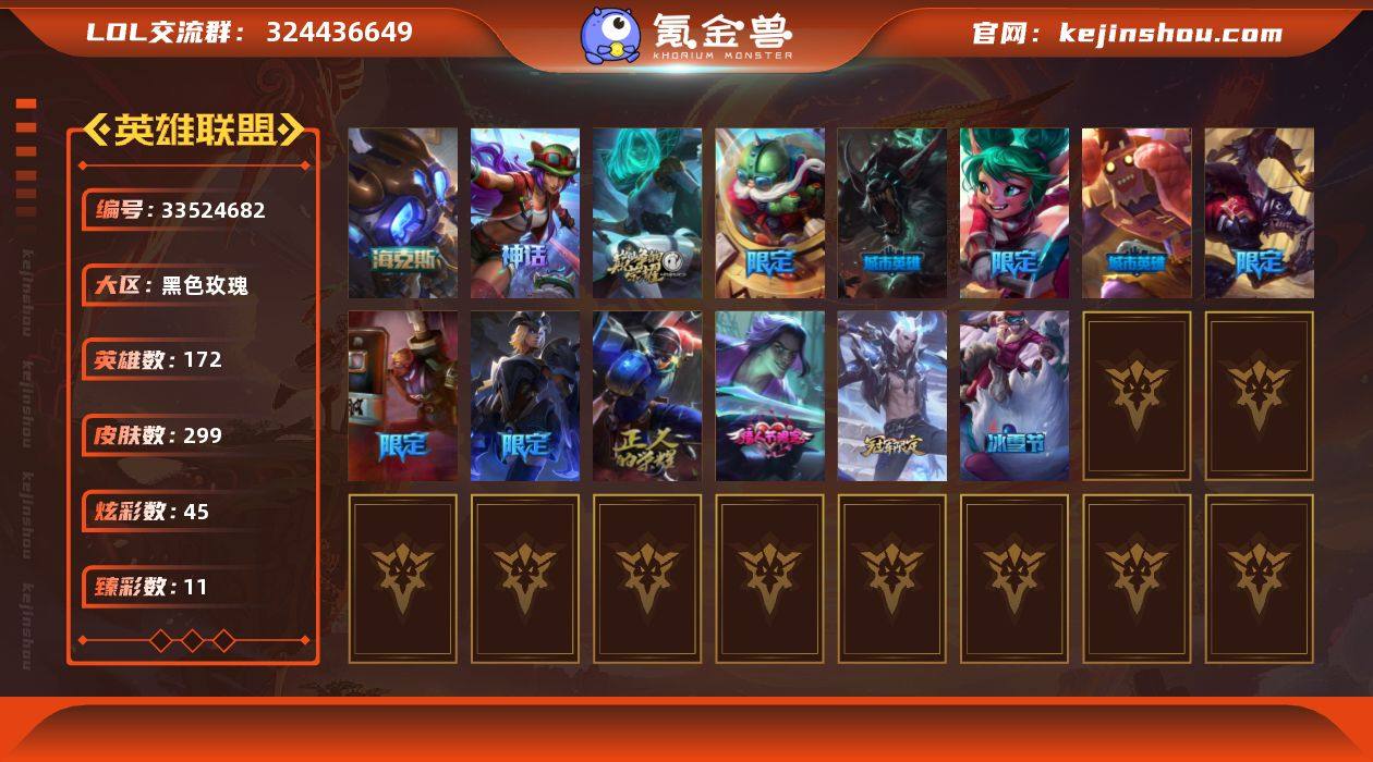 t39816【黑色玫瑰】299皮肤 45炫彩 11臻彩 4神话/25限定/27传说/172英雄 账号等级:791 【重要头像】烈焰美人薇恩 送披萨的小姐姐希维尔 【重要皮肤】海克斯科技阿木木 胜利行刑官德莱文 胜利女神娑娜 胜利之王泰达米尔 荣誉使者玛尔扎哈 点心宝贝阿木木 胜利女神奥莉安娜 胜利枪神格雷福斯 胜利之剑亚托克斯 幽梦玫瑰泰隆 魄罗骑士瑟庄妮 魅惑女巫崔丝塔娜 EDG佛耶戈 防暴士兵辛吉德 防暴天使凯尔 冠军之血希瓦娜 春晖大帝锤石 春晖神女艾希 蒙多蒙多 圣诞精灵崔丝塔娜 圣诞狂欢努努和威朗普 圣诞驯鹿克格莫 外星装甲库奇 暗影沃里克 波比的巧克力工坊 都铎王朝图奇 十五周年纪念希维尔 十周年纪念安妮 源代码乐芙兰 暗裔英雄盖伦 【传说皮肤】合金巨兽努努和威朗普 源计划毁灭派克 神王盖伦 神龙尊者圣龙李青 暗星尊烬 星之守护者拉克丝 上古战魂魔腾 女皇艾希 霸天异形卡兹克 神龙尊者昼日真龙亚索 女主播迦娜 冰霜之刃艾瑞莉娅 最终BOSS维迦 双重冰晶艾尼维亚 提莫约德尔人的一大步 死亡骑士盖伦 律政大亨蒙多 焰尾妖狐阿狸 绅士科加斯 地狱行者孙悟空 欧米伽小队幽灵特工 战场女武神凯尔 神拳李青 黑夜使者亚索...