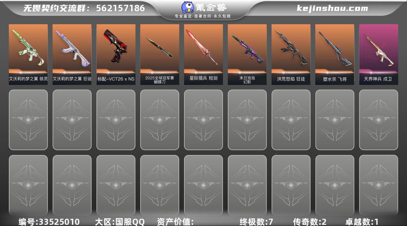 【英雄】:幻棱,炼狱,暮蝶,钛狐,壹决,铁臂,捷风,雷兹,幽影,不死鸟,贤者,猎枭,蝰蛇,零,芮娜,奇乐,尚勃勒,霓虹,夜露,星礈,K/O,海神,盖可,黑梦,钢锁【近战武器】:近战武器-2025全球冠军赛 蝴蝶刀,近战武器-星际猎兵 短剑【狂徒】:狂徒-洪荒怒焰,狂徒-艾沃莉的梦之翼【幻影】:幻影-末日泡泡【戍卫】:戍卫-天界神兵【飞将】:飞将-塑水宗【骇灵】:骇灵-艾沃莉的梦之翼【VCT手枪】:标配-VCT26 x NS【狂怒】:狂怒-蒙太奇【卡面】:Clutch 卡面,无畏契约GO!第一卷:芮娜 卡面,无畏契约GO!第一卷:零 卡面,无垠星环 卡面,《双城之战》金克丝 卡面,钢锁vs盖可 卡面,代号红色 卡面,新兵报到 卡面,V契约 卡面,无畏契约 卡面【喷漆】:惊声尖叫 喷漆,买装还是存钱 喷漆,松叶 喷漆,胜利属于无畏契约 喷漆,GLHF 喷漆,无畏契约 喷漆【挂饰】:天外飞客 挂饰,无畏契约 纪念币 挂饰