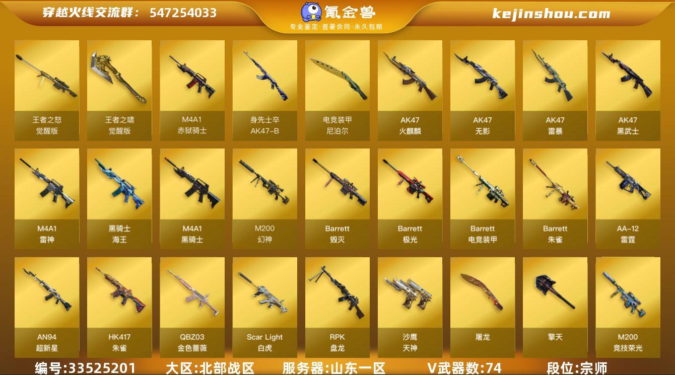 山东一区-78V-2王者武器数-0炫金武器数 【热门武器】:QBZ03-金色蔷薇,Scar Light-白虎,HK417-朱雀,M200-幻神,M200-竞技荣光,M4A1-黑骑士,RPK-盘龙*2,斯泰尔-蝴蝶,USP-雷暴 【音效卡】:AK47-火麒麟音效卡,M4A1-雷神音效卡,Barrett-毁灭音效卡 【皮肤】:幻神-星耀 皮肤,雷神-虎将*2,雷神-烈虎皮肤,火麒麟-轻羽皮肤,毁灭-黑大圣皮肤,AK47-B-常胜将军-刘备,AK47-B-常胜将军-孙权,AWM-天龙-传奇白鲨 【角色】:春,审判者,斗烈龙骑,炽天使,风暴女,虎妞,娟娟,灵狐者-X,灵狐者-职业经理,潘多拉-X,蜀雪,新娜塔莎 【人偶武器】:斯泰尔-蝴蝶,闪光弹-貂蝉,高爆手雷-大乔 【暴走生化】:超级对讲机 【挑战大师】:神圣爆裂者III,KAC-圣炎切割者III 【英雄级武器】:AK47-火麒麟,M4A1-雷神,M4A1-黑骑士,AK47-无影,AK47-黑武士*2,AN94-超新星,AK47-雷暴,HK417-朱雀,Scar Light-白虎,QBZ03-金色蔷薇,黑骑士-海王,AK47-B-常胜将军,AK47-B-身先士卒,AK47-B-战士,Barrett-毁灭,Barrett-极光,M200-幻神,Barrett-朱雀,Barrett-电竞装甲,M200-竞技荣光,王者之怒-觉醒版,RPK-盘龙*2,AA-12-雷霆,沙鹰-天神*2,USP-雷暴,柯尔特-电竞装甲,...