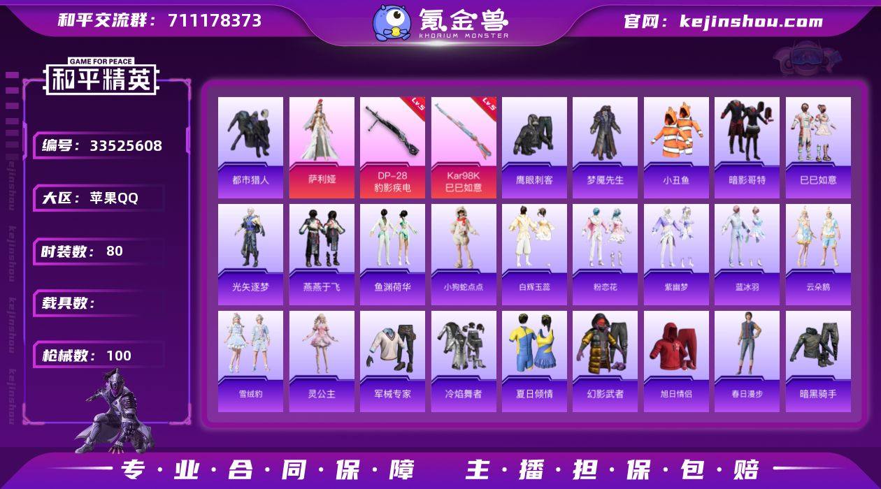 无二次-苹果手Q【都市猎人/红眼罩/小熊背包】-2粉装-7特效枪-0载具-0粉色飞行器-25428热力值-3王牌印记-80套装-100枪皮 【热门品类】:套装-都市猎人,套装-小丑鱼,套装-暗影哥特 【粉色套装】:角色-萨利娅,角色-鸢尾珑雾 【粉色枪皮等级】:ACE32-萌骑漫游(二级),UMP45-萌骑冒险(四级),AKS-74U-森灵之息(四级),Kar98K-巳巳如意(五级),Mk14-福马献瑞(五级),AA12-G-萌骑幻想(五级),DP-28-豹影疾电(五级) 【粉色枪皮】:ACE32-萌骑漫游,UMP45-萌骑冒险,AKS-74U-森灵之息,Kar98K-巳巳如意,Mk14-福马献瑞,AA12-G-萌骑幻想,DP-28-豹影疾电 【粉色降落伞】:戏水时光降落伞,异瞳寒姬降落伞 【稀有套装】:套装-巳巳如意,套装-小财神当家,角色-X,套装-马上来财,套装-迅捷龙虾,角色-光矢逐梦,套装-燕燕于飞,套装-鱼渊荷华,玩偶服-小狗蛇点点,套装-白辉玉蕊,套装-粉恋花,套装-紫幽梦,套装-蓝冰羽,套装-云朵鹅,套装-雪绒豹,角色-灵公主,套装-雨过天青,套装-红釉青花 【稀有枪皮】:AKM-冰凉西瓜,AKM-影袭,AKM-龙的传人,SCAR-L-夜灯,SCAR-L-玉兔迎春,SCAR-L-冷漠罗丽,M416-黄金龙骨,GROZA-影袭,AUG-月影灵韵,M762-彩虹符号,M762-云朵鹅,UZI-...