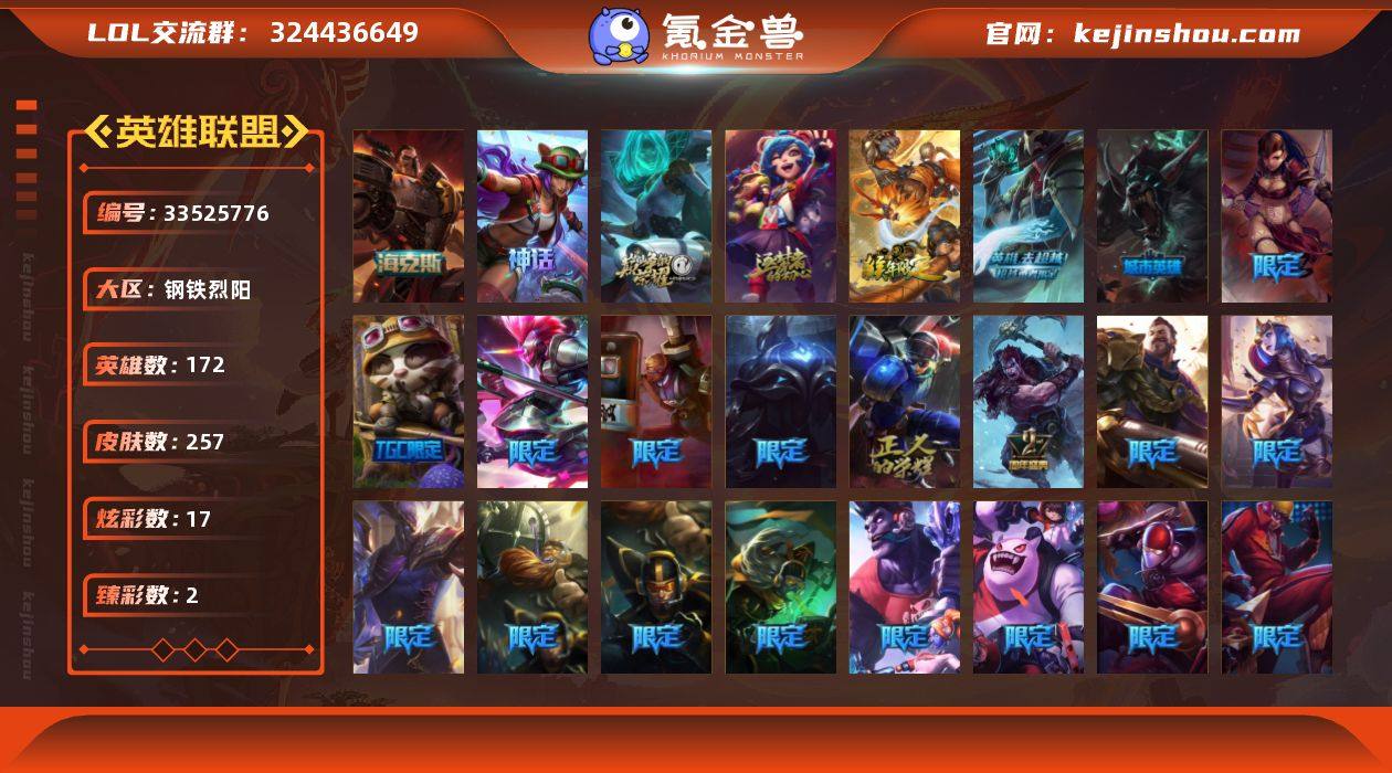 【LSA1495】172英雄/257皮肤/4神话/45限定/2臻彩/17炫彩/32传说/79史诗/未定级账号等级:267/10周年 安妮/源代码 乐芙兰/十五周年纪念 希维尔/恐惧新星 德莱厄斯/冠军之隐 劫 凯旋圣装/霸天巨兽·雪崩 墨菲特/美猴王 孙悟空/幸福女神 乐芙兰/圣诞精灵 崔丝塔娜/圣诞狂欢 努努/圣诞狂欢 时光/“主人不要我了” 阿木木/胡桃夹子 小丑/平安夜女神 娑娜/冬季仙境 卡尔玛/邪恶圣诞老人 维迦/冰雪节 茂凯/圣诞玩偶 波比/圣诞驯鹿 克格莫/冰雪节 炼金/地底世界 崔斯特/冠军之隐 劫/S1FNC 酒桶/S1FNC 嘉文四世/S1FNC 卡尔萨斯/S2 暗杀星 蒙多/S2 暗杀星 努努/S3 SKT T1 劫/S3 SKT T1 婕拉/S3 SKT T1 李青/S4 SSW 炼金/S4 SSW 锤石/S5 SKT T1 雷克顿/S6 SKT T1 艾克/2周年 德莱厄斯/胜利枪神 格雷福斯/胜利女神 奥莉安娜/胜利之剑 亚托克斯/海贼 瑞兹/无头骑士 赫卡里姆/泳池派对 厄运小姐/泳池派对 格雷福斯/泳池派对 雷克顿/泳池派对 蕾欧娜/泳池派对 李青/密林猎手 提莫/女猎手 希维尔/暗影 沃里克/电玩战魂 赫卡里姆/防暴士兵 辛吉德/防暴天使 凯尔/铁哥们儿 奥拉夫/魔幻卡牌 崔斯特/邪鸦魅影 乐芙兰/大天使长米迦勒 凯尔/源计划:林 易/烈焰雄心 崔丝塔娜/恶魔之刃 泰达米尔/鬼魂新娘...