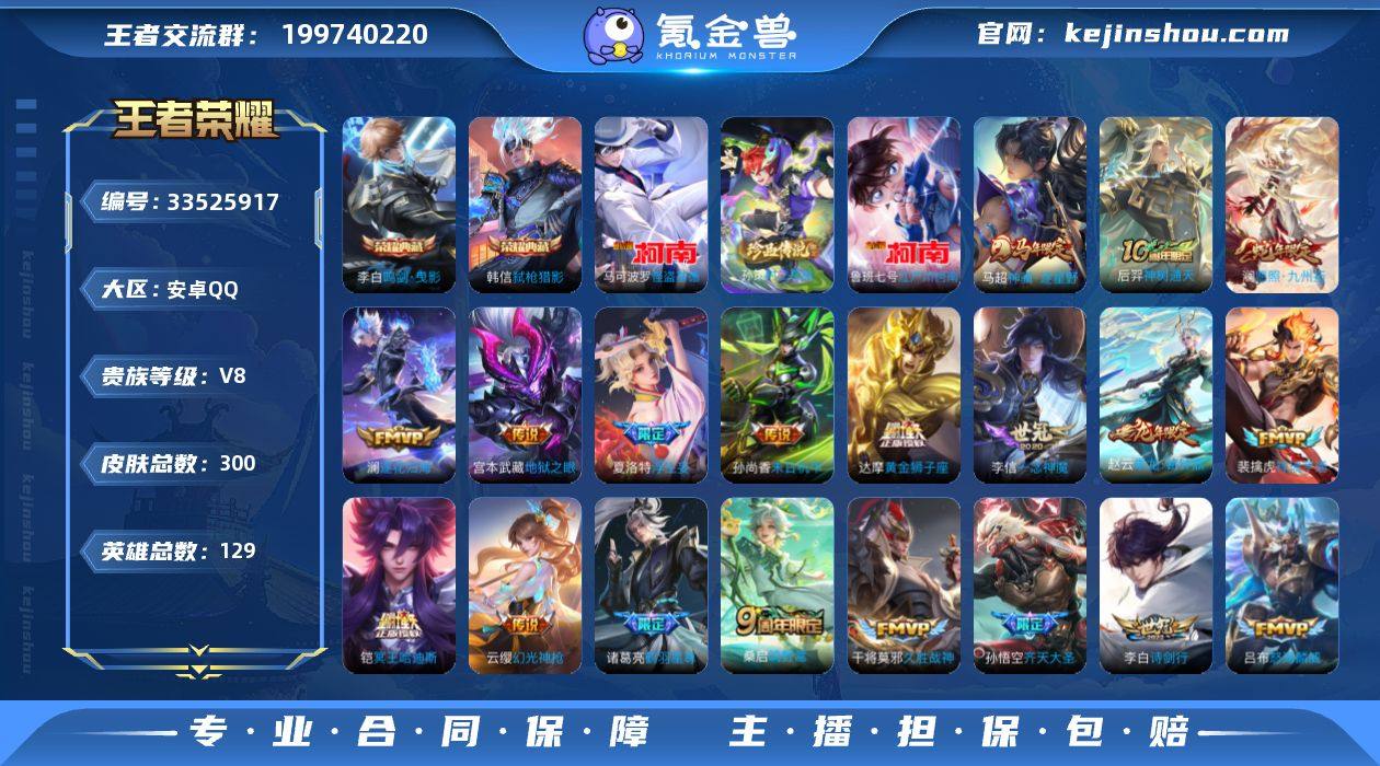 安卓Q-V8-最强王者段位-129英雄-300皮肤-2典藏皮肤-3珍品传说-26传说-85史诗 【英雄全皮】:嬴政全皮 【荣耀典藏】:李白鸣剑曳影,韩信弑枪猎影 【珍品传说】:孙策时之奇旅,鲁班七号江户川柯南,马可波罗怪盗基德 【传说皮肤】:马超神骥逐星野,后羿神树通天,澜愿照九州拓,云缨幻光神枪,裴擒虎祥瑞亨通,嬴政玄雷天君,桑启鸣野蒿,铠冥王哈迪斯,赵云乘龙铭钟鼎,澜逐花归海,诸葛亮鹤羽星尊,夏洛特浮生妄,花木兰燃星之曲,孙悟空齐天大圣,吕布怒海麟威,李白诗剑行,孙尚香音你闪耀,王昭君乞巧织情,虞姬启明星使,李信一念神魔,张良黄金白羊座,干将莫邪久胜战神,达摩黄金狮子座,孙尚香末日机甲,宫本武藏地狱之眼,孙悟空地狱火 【限定皮肤】:白起狰,铠冥王哈迪斯,姜子牙天穹之誓,李白谪仙醉月,狄仁杰阴阳师,赵云皇家上将,嬴政优雅恋人,嬴政白昼王子,鲁班七号狮舞东方,庄周高山流水,高渐离玩趣恶龙,芈月重明,吕布猎兽之王,元歌无心,夏侯惇朔风刀,甄姬游园惊梦,曹操烛龙,典韦穷奇,马可波罗暗影游猎,狄仁杰魔术师,狄仁杰万华元夜,达摩沙漠行僧,项羽海滩派对,老夫子醍醐杖,程咬金演武夺筹,兰陵王金庭之子,花木兰燃星之曲,孙悟空至...