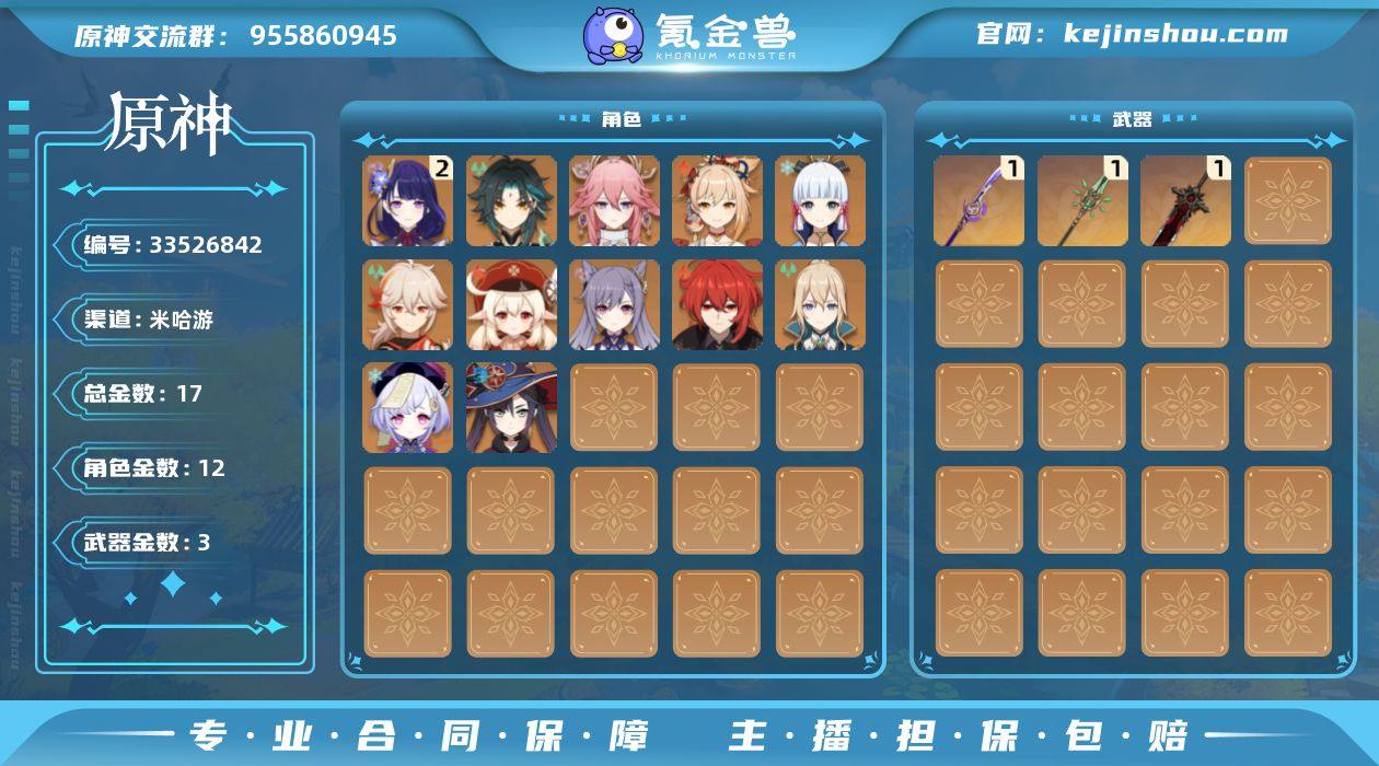 56级/17黄/女主/12个五星角色/3个五星武器 0命八重神子,2命雷电将军,0命枫原万叶,0命神里绫华,0命魈,0命宵宫,0命可莉,0命刻晴,0命七七,0命琴,0命莫娜,0命迪卢克,精1薙草之稻光,精1和璞鸢,精1狼的末路