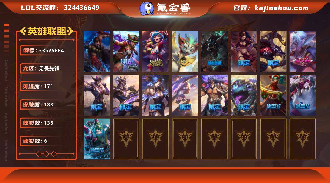 【LOLYH2201】171英雄/183皮肤/1终极/3神话/16限定/6臻彩/135炫彩/18传说/41史诗/未定级/10周年 安妮/十五周年纪念 希维尔/10周年庆典 凤凰/无畏骑士 瑟庄妮 赤子初心/冠军典狱长 锤石 凯旋圣装/西部天使 赛娜 贝利尔之怠/弹幕天使 卡莎 炽天使·公正/可爱可爱粉红红 布里茨/魔女 阿卡丽 虚荣/天龙之子 斯莫德/甜心之翎 洛/平安夜女神 娑娜/邪恶圣诞老人 维迦/魄罗骑士 瑟庄妮/灵魂守卫/胜利凤凰 艾尼维亚/胜利之王 泰达米尔/胜利巨口 克格莫/胜利女神 娑娜/胜利剑圣 易/胜利之运 崔斯特/胜利女神-菲奥娜/魅惑女巫 波比/女猎手 希维尔/暗影 沃里克/都铎王朝 图奇/战地机甲 厄加特/战场女武神 凯尔/恶魔男爵 瑞兹/欧米伽小队 幽灵特工/烈焰雄心 崔丝塔娜/女皇 艾希/红色男爵 库奇/未来战士 凯特琳/银河魔装机神 兰博/第三类接触 黑默丁格/月蚀骑士 蕾欧娜/绝息圣堂 锐雯/焰尾妖狐 阿狸/灵魂莲华 阿狸/女校长 菲奥娜/霸天异形 卡兹克/灌篮高手 德莱厄斯/神王 德莱厄斯/冰霜烈焰 安妮/铁血剑豪 易/地狱火 阿利斯塔/钢铁之心 希维尔/圣洁化身 索拉卡/荒野豺狼 沃里克/黑色荆棘 莫甘娜/炼金狂士 辛吉德/五杀摇滚键盘手 娑娜/恐惧新星 普朗克/穿着正装的恶魔 维迦/抵抗军天使 凯特琳/...