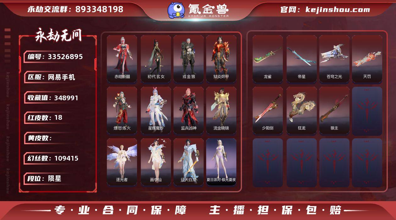 WJ6132,网易手机,5月18可换绑,三人段位陨星4,霜烬十殿门五百强,声望20,18红,647金,等级366,收藏值348991,幻丝109415,金砖50,通行证Lv4,变身器,荆魂,守望先锋DVa战斗机甲,绿野守护竹韵悠,洛天依音愈律阶,璃光洛天依共鸣,红色神品,监兵凶神,星辉魔纱,流金晓锦,逐光者,画中仙,征天白龙,戎金狼,赤皓新囍,初代玄女,狱炎烬甲,熛怒炼火,天罚,苍穹之光,帝星,龙雀,狼主,狂龙,少阳剑,角色金色皮肤,倒反阴阳狐踪,黄庭道,封神录申公豹,墨染千秋剪春漪,春日序曲寒芷,禄运玉霄,紫微星命,金襦玉衫,祸津素盏,麟鹿大铠,共赴无间赤焰舞影,倒反阴阳凛冬,巅峰极速蕾雅,浣烟纱,蜃楼魅影,瀚海苍鹰,福瑞天泽,街头狂欢不败擂主,冬无归,炽火照夜,百战断链,秋藏桂,P5R奥村春NOIR,绿野守护悠竹萌客,街头狂欢涂鸦少女,共赴无间幽夜玲珑,春不敛,赤阳天狐,护世四法广目天王,日影花阴,塔罗序衔环,卷王,冥渊,天工奥妙,墨染千秋钟鼎光,长歌诗韵念奴娇,怦然心动热力节拍,赤诚心,孤影戎装,云间影,赤焰战灵,绿野守护山漠狞影,古冢行,夏日派对极光夏夜,天虹咏,开辟鸿蒙日月明,雪铃绮歌,夏日派对绮夏幻梦,龙之道无拘,龙之...
