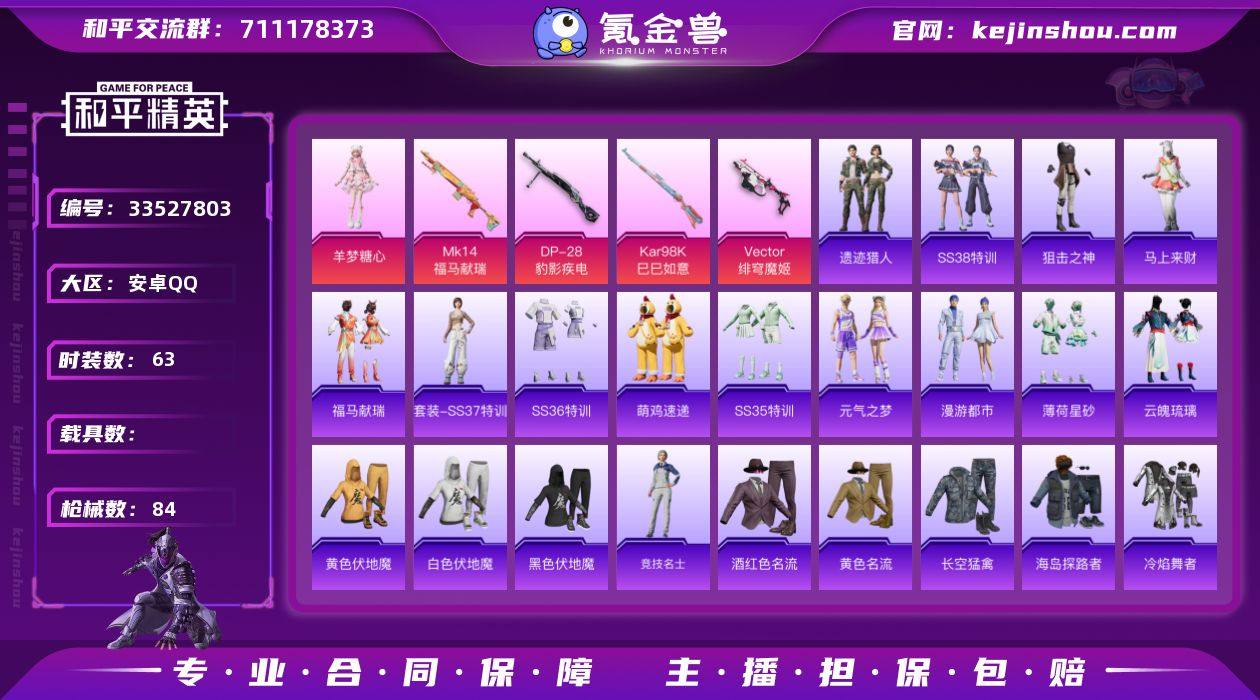 【0载具 4特效枪 1粉装 84枪皮 63套装】套装-老实芭蕉,角色-羊梦糖心 M416-黄金龙骨,Kar98K-巳巳如意,Mk14-福马献瑞,Vector-绯穹魔姬,DP-28-豹影疾电,编号:ZPQZY61