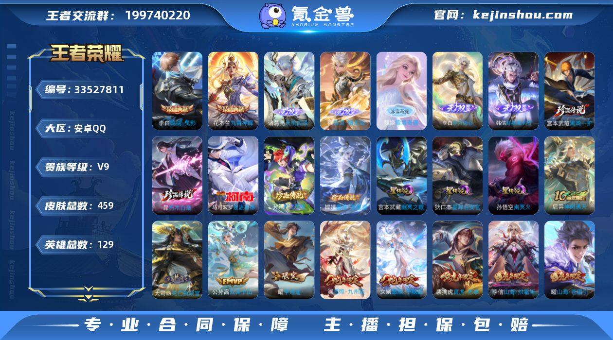 可换绑【V9高质量精品号·3金标·5无双·2典藏·5珍品怪盗基德·龙年全套·死亡执政官·鹤羽星尊·炽霜斩·苍雷引·李逍遥·永曜之星·玄木吟·傲雪梅枪·神威·302幸运值·13万贵族积分】302夺宝值,3星传说,2天幕,29按键,3413星币,25王者印记,满级铭文 可二次安卓Q-V9-459皮肤-2典藏皮肤-5无双-5珍品传说-29传说-146史诗【英雄全皮】:嬴政全皮,扁鹊全皮,孙权全皮,嫦娥全皮,大司命全皮,敖隐全皮,曜全皮,暃全皮,戈娅全皮,空空儿全皮,影全皮【荣耀典藏】:李白鸣剑曳影,花木兰九霄神辉【无双皮肤】:诸葛亮天机白泽,曜器灵螭龙剑,甄姬雪境奇遇,韩信群星魔术团,李白碎月剑心【珍品传说】:宫本武藏黑崎一护,暃朽木白哉,嫦娥器灵落星盏,孙策时之奇旅,马可波罗怪盗基德【星元皮肤】:狄仁杰星际治安官,宫本武藏幽冥之眼,孙悟空幽冥火【天幕】:江户川柯南天幕,怪盗基德天幕【传说皮肤】:后羿神树通天,大司命死亡执政官,公孙离云诺千山,女娲愿照千秋盛,澜愿照九州拓,云缨幻光神枪,嬴政玄雷天君,桑启鸣野蒿,夏侯惇霜北刀,孙尚香乘龙问璇玑,孙策乘龙淬吴钩,赵云乘龙铭钟鼎,露娜霜月吟,诸葛亮鹤羽星尊,曜山海苍雷引,李信山海炽霜斩,李白诗剑行,孙策挚爱...