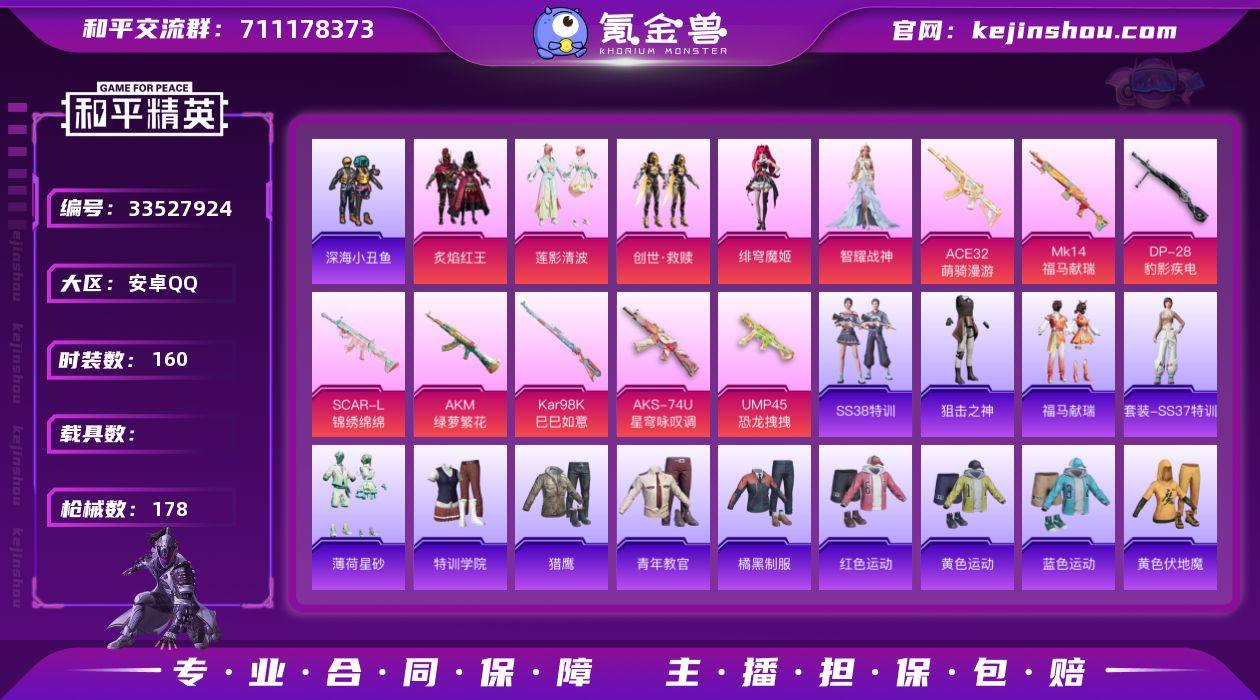 【0载具 8特效枪 5粉装 178枪皮 160套装】螳螂 深海小丑鱼 套装-深海小丑鱼,套装-炙焰红王,套装-莲影清波,套装-老实芭蕉,角色-Mark.06,套装-创世·救赎,角色-绯穹魔姬,角色-智耀战神 SCAR-L-锦绣绵绵,AKM-绿萝繁花,ACE32-萌骑漫游,Kar98K-巳巳如意,Mk14-福马献瑞,AKS-74U-星穹咏叹调,UMP45-恐龙拽拽,DP-28-豹影疾电,编号:ZPANZ54