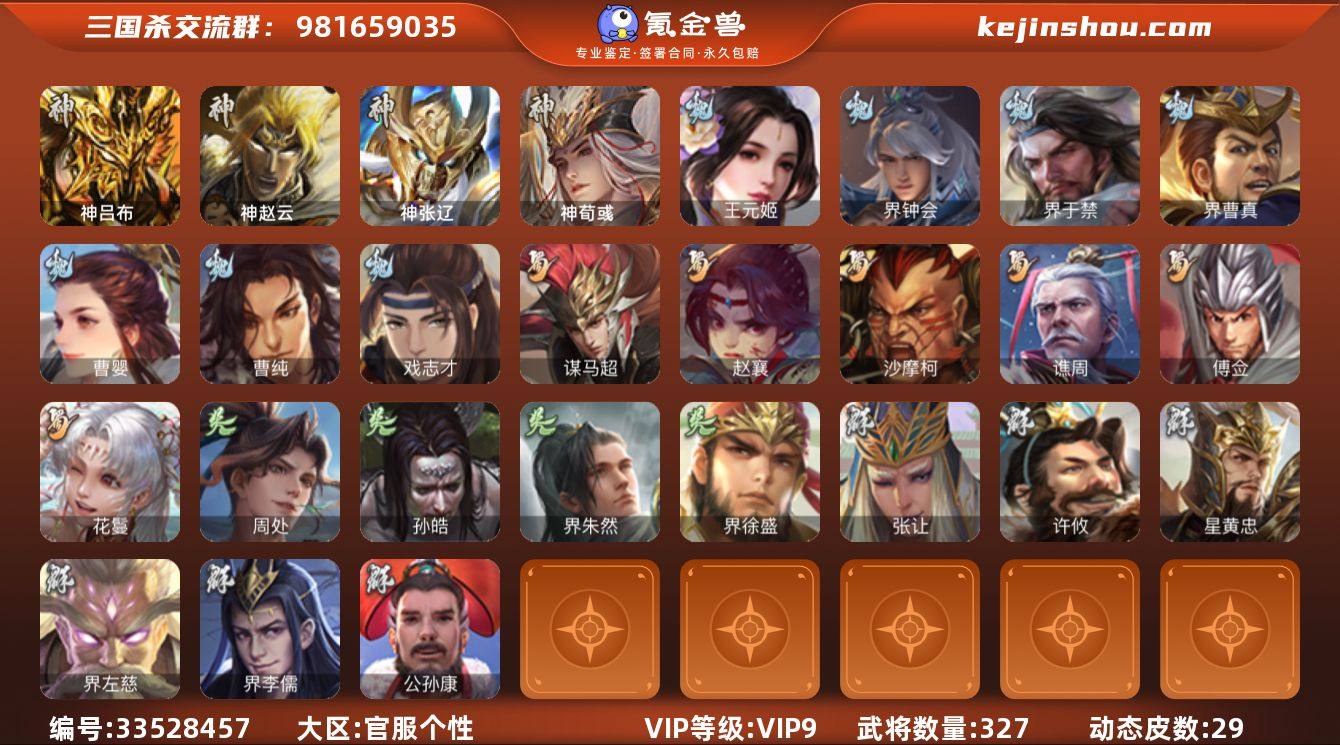 [17693631]标题:S36572 VIP等级:VIP9 官阶:骠骑将军 史诗武将数量:33 动态皮肤数量:29 史诗宝珠数量:81 将魂数量:5127 雁翎数量:54807 心愿积分:13536 史诗武将(魏国):曹婴,王元姬,界钟会,戏志才,界曹真,界于禁,程昱,曹纯 史诗武将(蜀国):傅佥,沙摩柯,花鬟,谯周,赵襄,谋马超 史诗武将(吴国):界徐盛,势太史慈,周处,界朱然,孙皓 史诗武将(群雄):界左慈,许攸,界李儒,星黄忠,张让,审配,左慈,兀突骨,沮授,公孙康 史诗武将(神将):神荀彧,神赵云,神吕布,神张辽 其他亮点:欢乐豆216881,有年卡