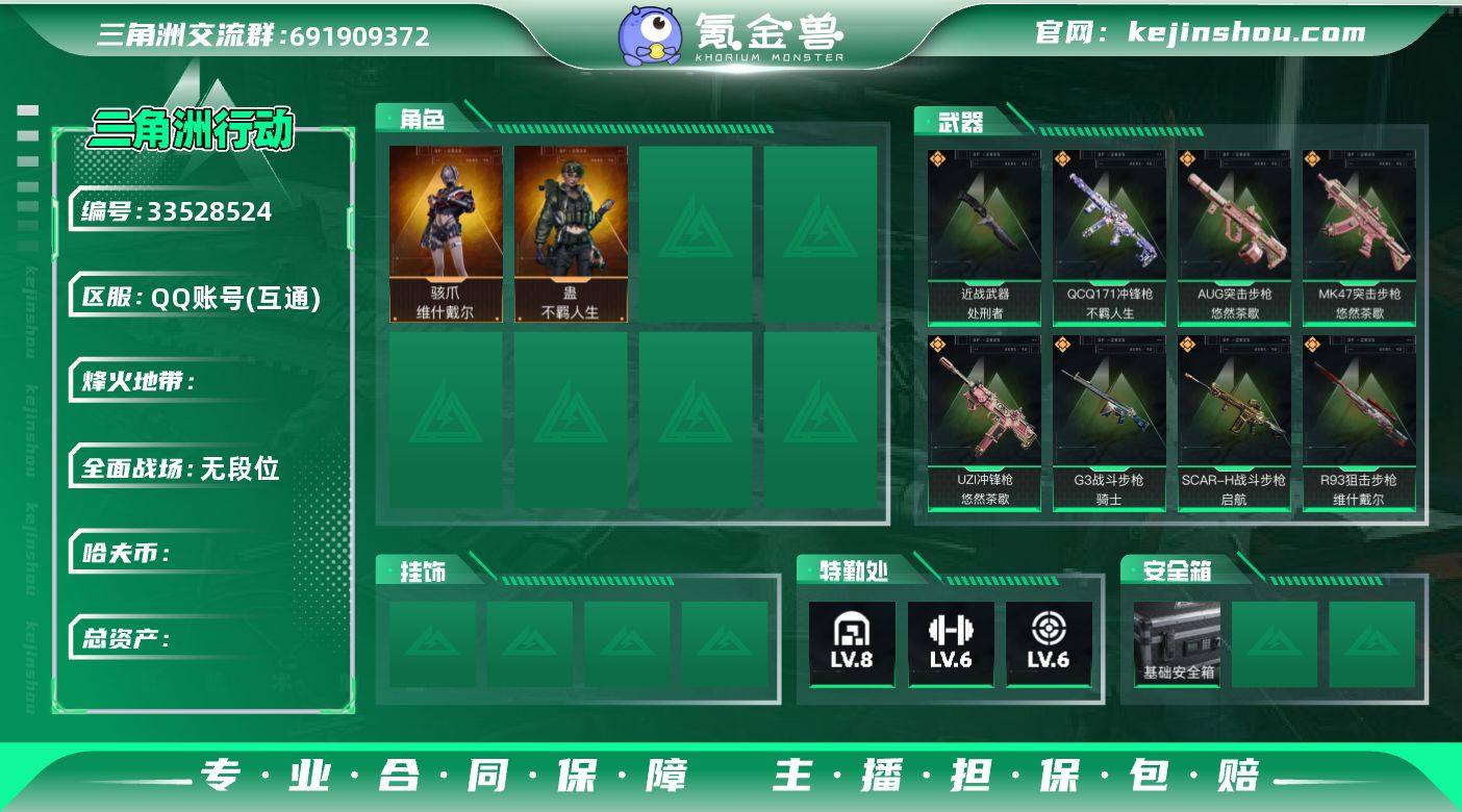 【总资产192.35M 哈弗币1.7亿 干员外观2个 烽火60级 黄金】仓库192m 现金168m 黑鹰,处刑者 蛊-不羁人生,骇爪-维什戴尔 AUG突击步枪-悠然茶歇,SCAR-H战斗步枪-启航,G3战斗步枪-骑士,MK47突击步枪-悠然茶歇,UZI冲锋枪-悠然茶歇,勇士冲锋枪-能天使·午夜邮差,QCQ171冲锋枪-不羁人生,R93狙击步枪-维什戴尔 德33/4 df52-31,编号:WPLSS41