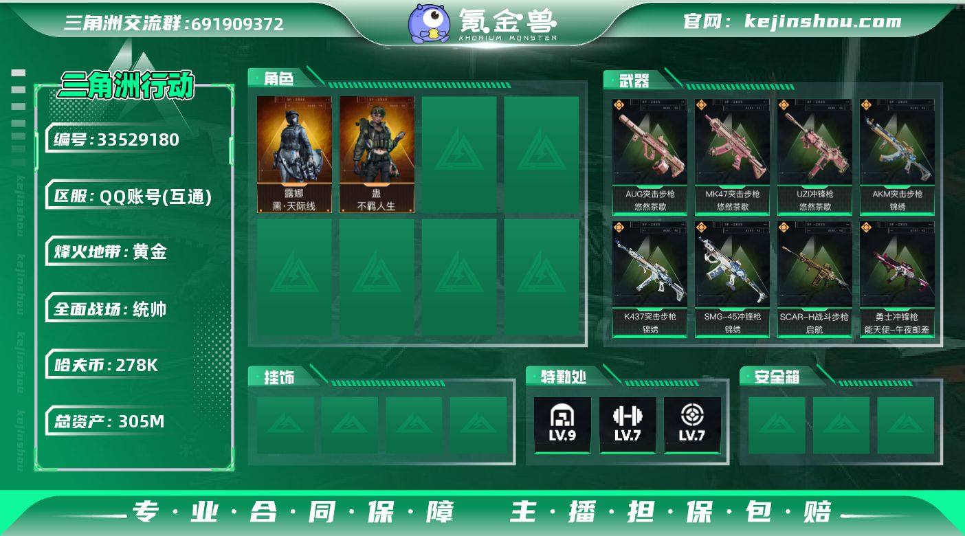 305m总资产-278k哈夫币-60烽火等级-黄金-50战场等级-统帅【干员外观】:露娜-黑·天际线,蛊-不羁人生【近战皮肤】:近战-处刑者2级,近战-黑鹰【传说外观】:M4A1突击步枪-阿米娅,AKM突击步枪-锦绣,M16A4突击步枪-狩猎时刻,AUG突击步枪-悠然茶歇,SCAR-H战斗步枪-启航,G3战斗步枪-狩猎时刻,CAR-15突击步枪-阿米娅,腾龙突击步枪-捞点薯条,K437突击步枪-锦绣,MK47突击步枪-悠然茶歇,Vector冲锋枪-狩猎时刻,UZI冲锋枪-悠然茶歇,SMG-45冲锋枪-锦绣,勇士冲锋枪-能天使-午夜邮差,AWM狙击步枪-捞点薯条,93R-捞点薯条,复合弓-黑·天际线【史诗外观】:AKM突击步枪-林中猎手,K416突击步枪-阿萨拉特攻,M16A4突击步枪-竞赛选手,AUG突击步枪-蝮蛇,SCAR-H战斗步枪-囚徒,腾龙突击步枪-猎鳄行动,MP5冲锋枪-深海恐惧,P90冲锋枪-紧急戒备,Vector冲锋枪-阿萨拉文明,SMG-45冲锋枪-阿萨拉特攻,勇士冲锋枪-深海恐惧,MP7冲锋枪-六套之力,M1014霰弹枪-林中猎手,S12K霰弹枪-曙光,725双管霰弹枪-炽焰,PKM通用机枪-蝮蛇,M250通用机枪-囚徒,QJB201轻机枪-Old Habits,SVD狙击步枪-阿萨拉工艺,SV-98狙击步枪-林中猎手,SV-98狙击步枪-囚徒,R93狙击步枪-竞赛选手,M700狙...