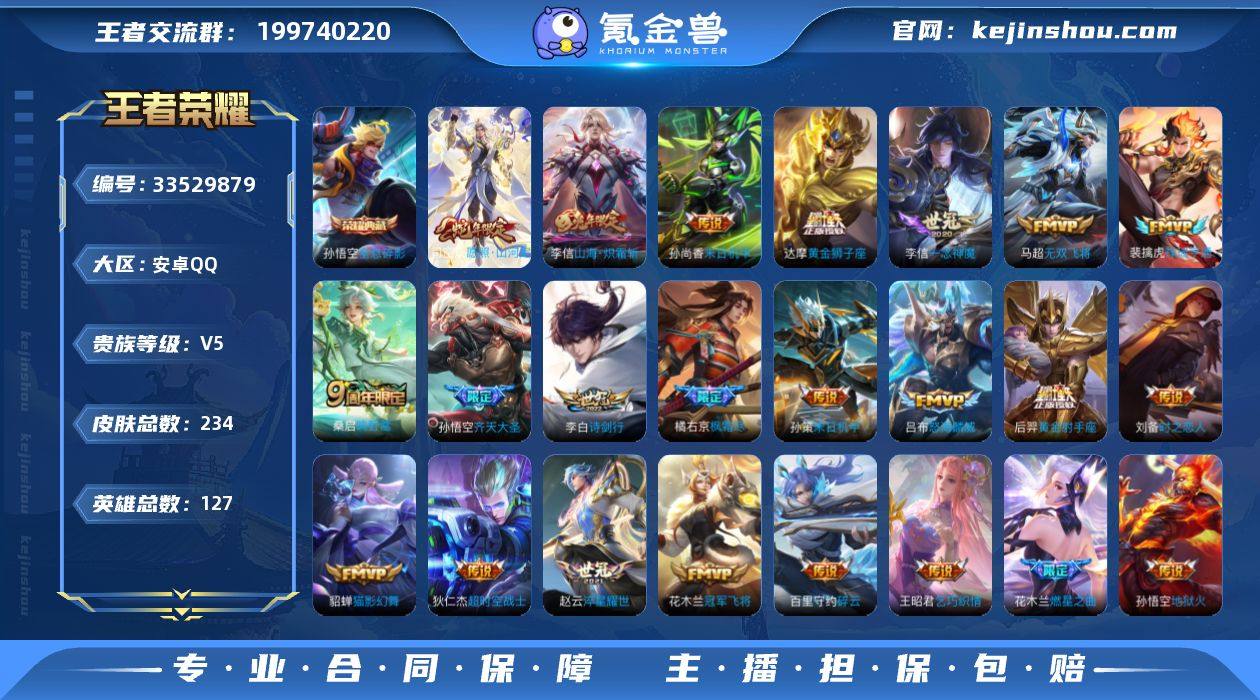 账号亮点:孙悟空全息碎影 司空震愿照山河定,裴擒虎祥瑞亨通,桑启鸣野蒿,花木兰燃星之曲,孙悟空齐天大圣,李信山海炽霜斩,吕布怒海麟威,李白诗剑行,百里守约碎云,橘右京枫霜尽,马超无双飞将,孙策末日机甲,赵云淬星耀世,王昭君乞巧织情,李元芳飞鸢探春,铠绛天战甲,虞姬启明星使,李信一念神魔,刘备时之恋人,貂蝉猫影幻舞,达摩黄金狮子座,花木兰冠军飞将,后羿黄金射手座,孙尚香末日机甲,孙悟空地狱火,狄仁杰超时空战士583-3 【荣耀典藏】:孙悟空全息碎影 【传说皮肤】:司空震愿照山河定,裴擒虎祥瑞亨通,桑启鸣野蒿,花木兰燃星之曲,孙悟空齐天大圣,李信山海炽霜斩,吕布怒海麟威,李白诗剑行,百里守约碎云,橘右京枫霜尽,马超无双飞将,孙策末日机甲,赵云淬星耀世,王昭君乞巧织情,李元芳飞鸢探春,铠绛天战甲,虞姬启明星使,李信一念神魔,刘备时之恋人,貂蝉猫影幻舞,达摩黄金狮子座,花木兰冠军飞将,后羿黄金射手座,孙尚香末日机甲,孙悟空地狱火,狄仁杰超时空战士 【限定皮肤】:狄仁杰阴阳师,赵云皇家上将,孙尚香蔷薇恋人,钟无艳超时空战士,芈月幻夜卜梦,元歌无心,甄姬落雪兰心,马可波罗暗影游猎,马可波罗山海玄木吟,狄仁...