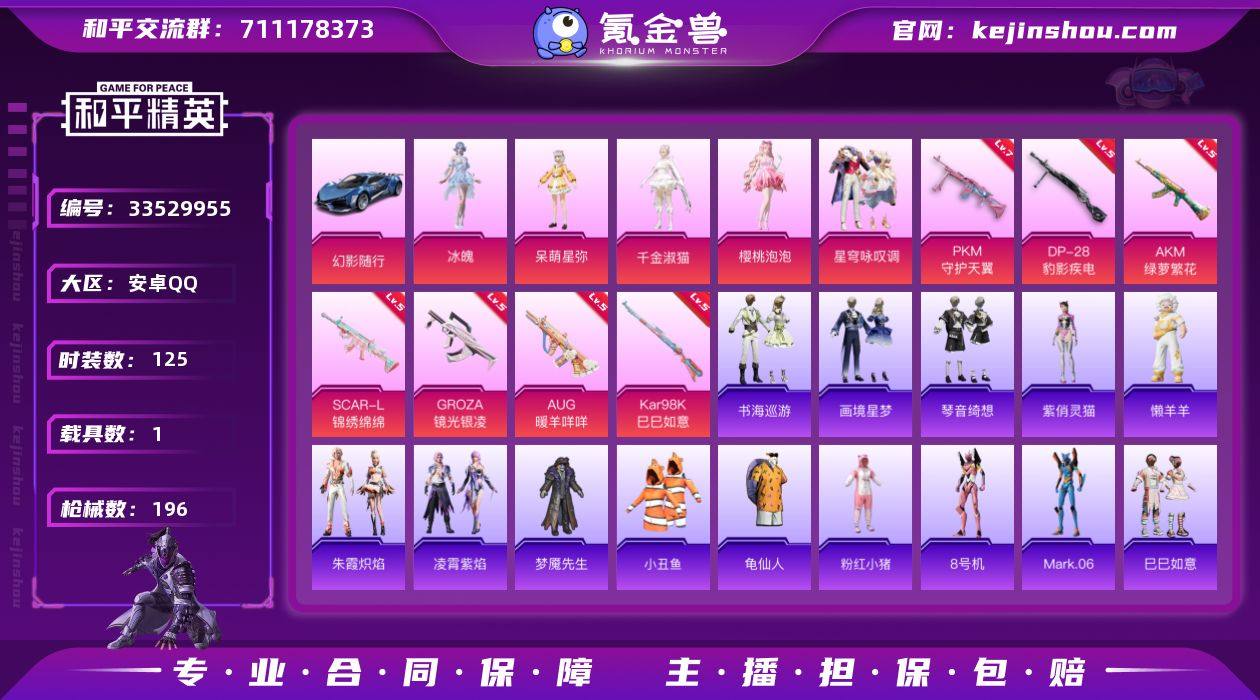 LK264166 有二次女生号安卓 手Q-5粉装-8特效枪-1载具-3粉色飞行器-56883热力值-14王牌印记-125套装-196枪皮 【热门品类】:套装-小丑鱼,套装-龟仙人,套装-粉红小猪,角色-8号机,角色-Mark.06 【粉色套装】:角色-呆萌星弥,角色-千金淑猫,角色-樱桃泡泡,粉装-星穹咏叹调,角色-冰魄 【粉色枪皮等级】:AKM-绿萝繁花(五级),SCAR-L-锦绣绵绵(五级),GROZA-镜光银凌(五级),AUG-暖羊咩咩(五级),Kar98K-巳巳如意(五级),Mk14-福马献瑞(一级),DP-28-豹影疾电(五级),PKM-守护天翼(七级) 【粉色载具】:幻影随行 【粉色枪皮】:AKM-绿萝繁花,SCAR-L-锦绣绵绵,GROZA-镜光银凌,AUG-暖羊咩咩,Kar98K-巳巳如意,Mk14-福马献瑞,DP-28-豹影疾电,PKM-守护天翼 【粉色飞行器】:炫彩糖果飞行器,凤舞九天飞行器,月下星之子飞行器 【粉色降落伞】:洛神天依降落伞,炫光之旅降落伞,初号机 觉醒Ver.降落伞,金丰海韵降落伞,BEARBRICK降落伞,未来领航者降落伞,千金淑猫降落伞,月影灵韵降落伞,彩虹独角兽降落伞,星穹咏叹调降落伞,绯穹魔姬降落伞,喜羊羊与灰太狼降落伞,炫彩糖果降落伞 【稀有套装】:套装-龟仙人,套装-巳巳如意,套装-雪国风尚,套装-炫彩糖果,套装-...