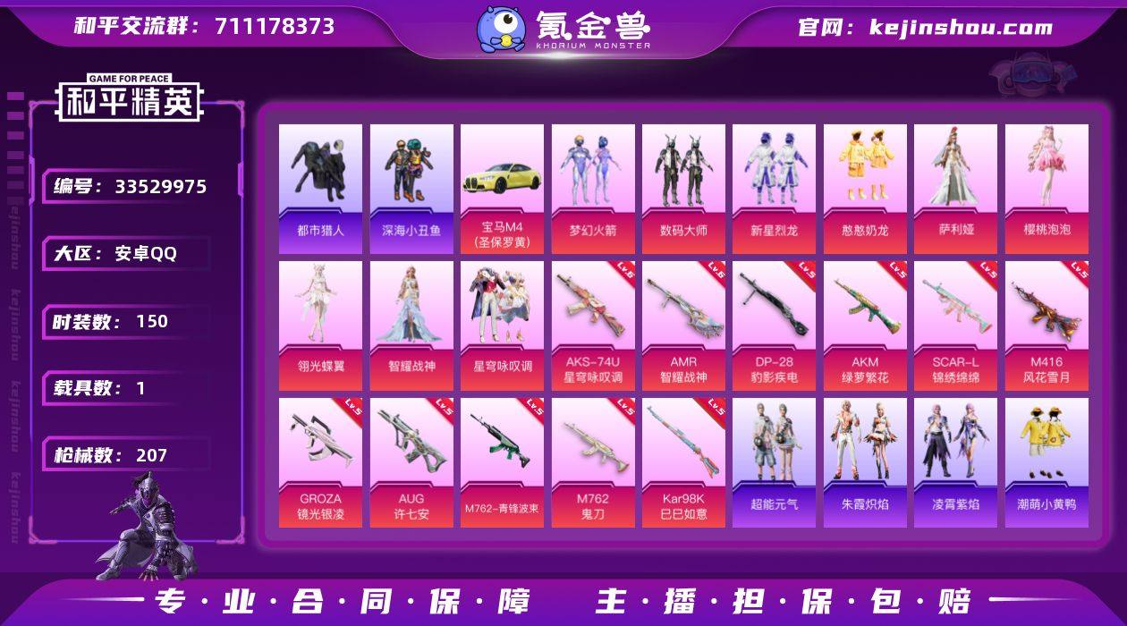 安卓【素材号/梦幻火箭/都市猎人/小丑鱼/AG战队服/暗影哥特/蓝螳螂/百万伏特背包/萌熊伴侣背包/9粉装-13特效枪-1载具-8粉色飞行器】 手Q--68871热力值-7王牌印记-150套装-207枪皮 【热门品类】:粉装-梦幻火箭,套装-浪漫天命,套装-都市猎人,套装-深海小丑鱼,套装-小丑鱼,套装-AG战队服,套装-龟仙人,套装-潮萌小黄鸭,套装-暗影哥特,套装-软软马卡龙,角色-Mark.06,角色-六号稻草人,熔岩游骑兵连帽夹克,套装-红熊茄茄 【粉色套装】:粉装-数码大师,粉装-梦幻火箭,粉装-新星烈龙,粉装-憨憨奶龙,角色-萨利娅,角色-樱桃泡泡,角色-翎光蝶翼,角色-智耀战神,粉装-星穹咏叹调 【粉色枪皮等级】:AKM-绿萝繁花(五级),SCAR-L-锦绣绵绵(五级),M416-风花雪月(五级),GROZA-镜光银凌(五级),AUG-许七安(五级),M762-青锋波束(五级),M762-鬼刀(五级),AKS-74U-星穹咏叹调(六级),Kar98K-巳巳如意(五级),Mk14-福马献瑞(二级),AMR-智耀战神(六级),AA12-G-萌骑幻想(五级),DP-28-豹影疾电(五级) 【粉色载具】:宝马M4(圣保罗黄) 【粉色枪皮】:AKM-绿萝繁花,SCAR-L-锦绣绵绵,M416-风花雪月,GROZA-镜光银凌,AUG-许七安,M762-青锋波束,M762-鬼刀,AKS-74U-星穹...
