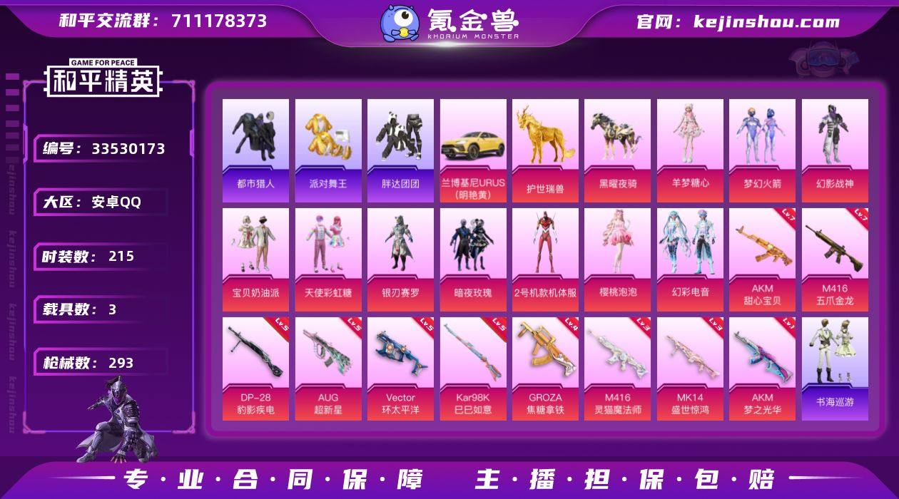安卓【男神号 粉装-梦幻火箭,套装-浪漫天命,套装-都市猎人,套装-派对舞王,套装-胖达团团,套装-暗影哥特,角色-2号机款机体服,AKM-甜心宝贝(七级),AKM-梦之光华(一级),M416-五爪金龙(七级),AUG-超新星(五级),兰博基尼URUS(明艳黄),护世瑞兽,百万伏特背包(3级)】 手Q-10粉装-14特效枪-3载具-7粉色飞行器-102305热力值-20王牌印记-215套装-293枪皮 【热门品类】:粉装-梦幻火箭,套装-浪漫天命,套装-都市猎人,套装-派对舞王,角色-军刀雅典娜,套装-胖达团团,套装-龟仙人,套装-暗影哥特,套装-浪漫波比,熔岩游骑兵连帽夹克 【粉色套装】:粉装-幻影战神,粉装-宝贝奶油派,粉装-天使彩虹糖,粉装-梦幻火箭,粉装-银刃赛罗,粉装-暗夜玫瑰,角色-2号机款机体服,角色-樱桃泡泡,粉装-幻彩电音,角色-羊梦糖心 【粉色枪皮等级】:AKM-甜心宝贝(七级),AKM-梦之光华(一级),M416-五爪金龙(七级),M416-灵猫魔法师(三级),GROZA-焦糖拿铁(四级),AUG-超新星(五级),UMP45-萌骑冒险(三级),Vector-环太平洋(五级),AKS-74U-森灵之息(五级),Kar98K-巳巳如意(五级),Mk14-盛世惊鸿(三级),Mk14-福马献瑞(五级),DP-28-豹影疾电(五级),燃烧瓶-薄荷可可(三级) 【粉色...