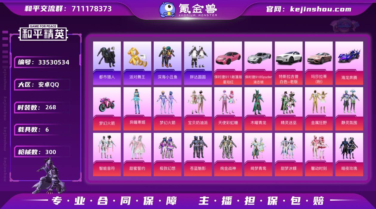 连体王者v9 都市 眼罩满级地铁安卓 手Q-21粉装-13特效枪-6载具-5粉色飞行器-120762热力值-14王牌印记-268套装-300枪皮 【热门品类】:粉装-梦幻火箭,套装-浪漫天命,套装-都市猎人,套装-派对舞王,套装-深海小丑鱼,套装-小丑鱼,套装-胖达圆圆,套装-龟仙人,套装-潮萌小黄鸭,套装-暗影哥特,套装-浪漫波比,套装-粉红小猪 【粉色套装】:粉装-宝贝奶油派,粉装-天使彩虹糖,粉装-木曜青龙,粉装-精灵迷巫,粉装-梦幻火箭,粉装-金属狂野,粉装-静灵氛围,粉装-智能音符,粉装-甜蜜誓约,粉装-极致幻想,粉装-苍蓝魅影,粉装-绚金战神,粉装-绮梦青鸾,粉装-甜梦冰蝶,粉装-馨动时刻,粉装-暗夜玫瑰,粉装-彩虹鹿灵,粉装-山涧鹿灵,粉装-甜梦小狐,角色-千金淑猫,角色-异瞳寒姬 【粉色枪皮等级】:AKM-炫紫旋律(四级),AKM-梦之光华(五级),SCAR-L-梦幻火箭(五级),M416-五爪金龙(五级),M416-心之恋语(六级),M762-甜蜜誓约(五级),蜜獾-异瞳寒姬(四级),UMP45-萌骑冒险(三级),AKS-74U-森灵之息(四级),P90-金丰海韵(五级),Kar98K-巳巳如意(五级),Mk14-福马献瑞(五级),DP-28-豹影疾电(五级) 【粉色载具】:特斯拉Model X(珍珠白),玛莎拉蒂Ghibli(粉),保时捷9...
