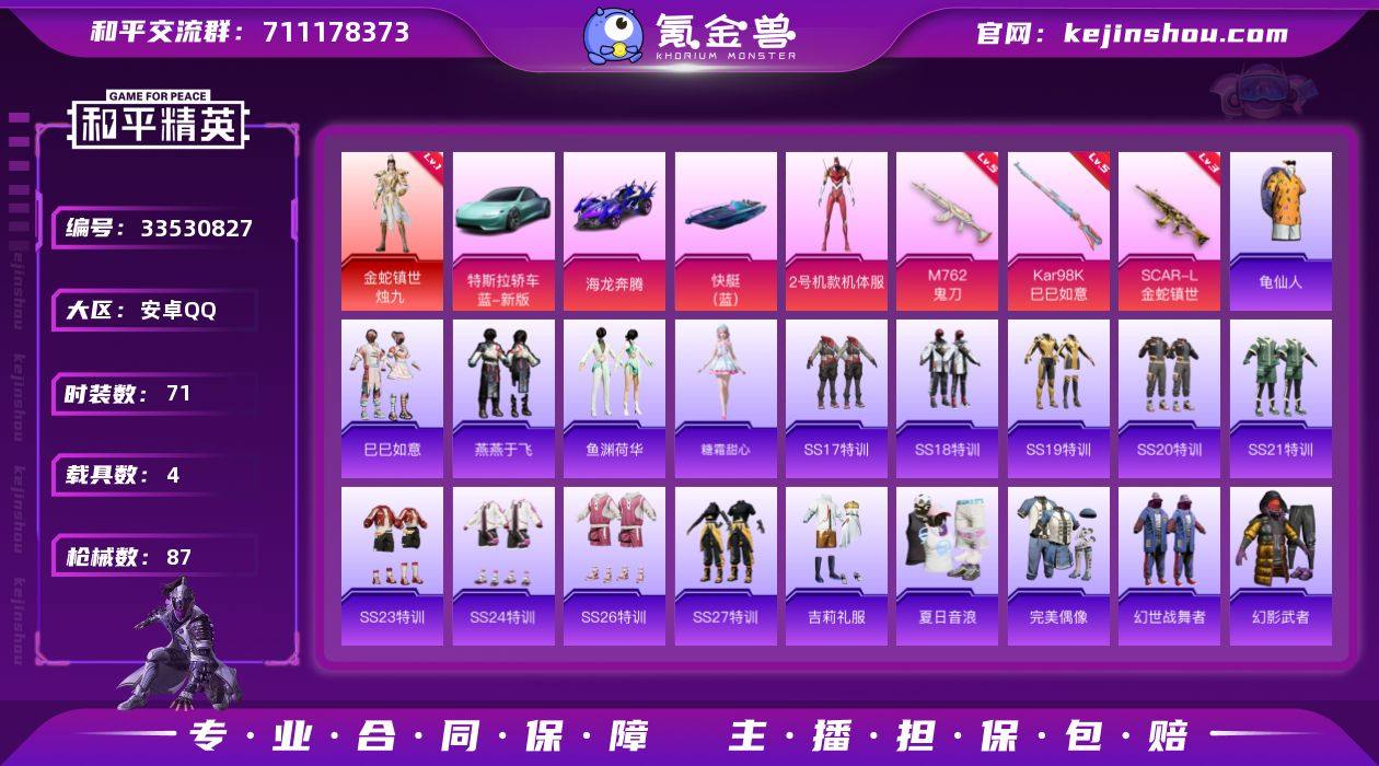 71套装/枪械3/装备70/载具4/战备55/王牌印记5/热力值32070/三级SCAR-L金蛇镇世/五级M762-鬼刀/五级Kar98K-巳巳如意/一级金蛇镇世-烛九/金蛇镇世-烛九/龟仙人/2号机款机体服/特斯拉Roadster(水滴蓝)/海龙奔腾/空客H135-蔚蓝之翼/快艇-塞莎KL27(深潜蓝)/SCAR-L金蛇镇世/M762-鬼刀/Kar98K-巳巳如意/万象金身飞行器/垂柳戏鸭降落伞/创世·救赎降落伞/金蛇镇世降落伞/巳巳如意/燕燕于飞/鱼渊荷华/糖霜甜心/AKM-彩虹符号/AKM-破晓战魂/AKM-虎虎生威/AKM-霓虹街区/M16A4-幻世战舞者/M16A4-红色方程式/SCAR-L-暗夜玫瑰/SCAR-L-玉兔迎春/M416-糯团青竹/M416-红色方程式/M416-蓝色火焰/GROZA-彩虹符号/GROZA-治愈之星/AUG-耀粉歌者/AUG-金蛇镇世/QBZ-飞驰魅影/M762-天降萌叽/M762-彩虹符号/M762-能量风暴/AC-VAL-天降萌叽/UZI-幻影战神/UZI-炫彩节奏/UMP45-夜灯/Vector-生命誓言/汤姆逊-炫彩节奏/汤姆逊-耀粉歌者/P90-飞驰魅影/P90-金蛇镇世/P90-巳巳如意/Kar98K-彩虹符号/Kar98K-炫彩节奏/Kar98K-红色方程式/Kar98K-飞驰魅影/AWM-王牌四分卫/SKS-炫彩节奏/Mini14-耀粉歌者/M417-惊鸿侠骨/M200-惊鸿侠骨/MK12-金蛇镇世/S686-生命誓言/S1897-飞驰魅影/S12K-破晓战魂/DBS-彩虹符号/M249-彩...