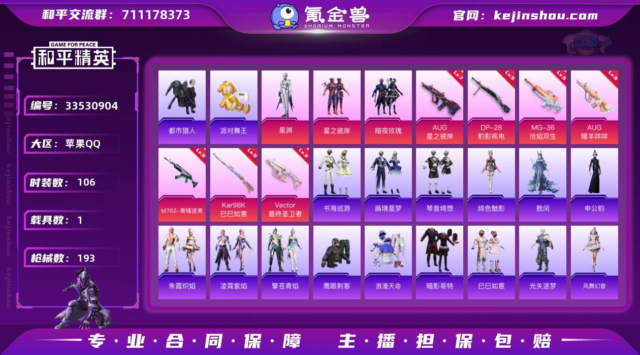 苹果 【素材号 套装-都市猎人/套装-派对舞王/套装-暗影哥特/套装-浪漫天命/AUG-星之彼岸(七级)/AUG-暖羊咩咩(五级)/暮色幽蹄】手Q-3粉装-13特效枪-1载具-7粉色飞行器-53436热力值-8王牌印记-106套装-193枪皮 【热门品类】:套装-浪漫天命,套装-都市猎人,套装-派对舞王,套装-AG战队服,套装-暗影哥特 【粉色套装】:粉装-星之彼岸,粉装-暗夜玫瑰,角色-星渊 【粉色枪皮等级】:AKM-暮色玫影(三级),M416-天马神君(三级),AUG-星之彼岸(七级),AUG-暖羊咩咩(五级),M762-青锋波束(五级),ACE32-萌骑漫游(二级),Vector-最终圣卫者(三级),AKS-74U-森灵之息(五级),Kar98K-巳巳如意(五级),Mk14-福马献瑞(五级),DP-28-豹影疾电(五级),MG-36-沧焰双生(五级) 【粉色载具】:暮色幽蹄 【粉色枪皮】:AKM-暮色玫影,M416-天马神君,AUG-星之彼岸,AUG-暖羊咩咩,M762-青锋波束,ACE32-萌骑漫游,Vector-最终圣卫者,AKS-74U-森灵之息,Kar98K-巳巳如意,Mk14-福马献瑞,DP-28-豹影疾电,MG-36-沧焰双生,破片手榴弹-贪吃小熊 【粉色飞行器】:香车宝马飞行器,炫彩糖果飞行器,飞天猪飞行器,暮色之舞飞行器,踏卷乘风飞行器 【粉色降落伞】:星之彼岸降落伞,洛神天依降落伞,...