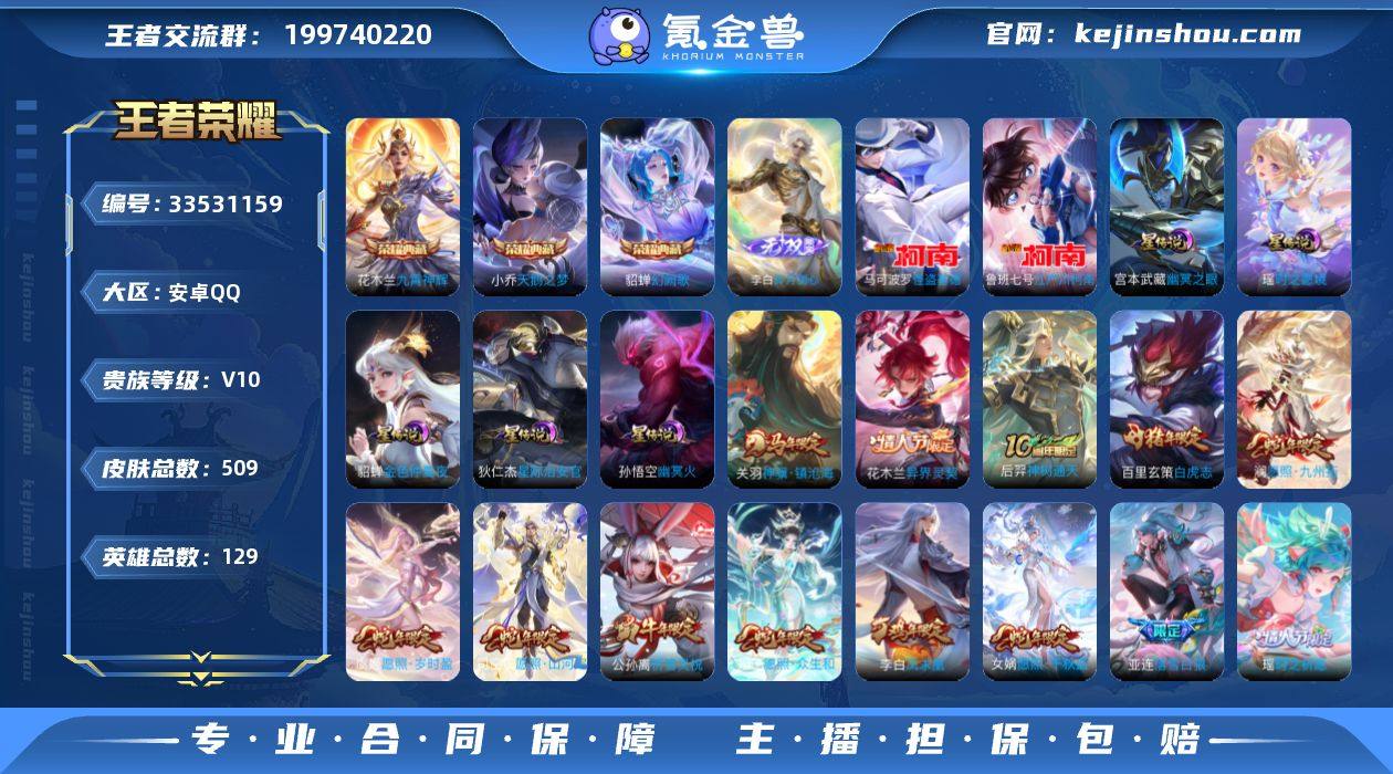 可换绑【V10高质量精品号·梅西·花木兰全皮·1.3万老虎·金标澜·3典藏·李白无双·2珍品怪盗基德·关羽马限·花木兰异界灵契·蛇年龙年全套·朵莉亚心动手记·落雪白狼·化雀舞·大乔时之奇旅·浮生妄·燃星之曲·炽霜斩·苍雷引·补天·瑶时之祈愿·孙尚香异界灵契·时雨天司·祈雪灵祝·白虎志·凤求凰·18万贵族积分】6星传说 1天幕 26按键 250幸运值 31戳戳 22王者印记 满级铭文 可二次安卓Q-V10-509皮肤-3典藏皮肤-1无双-2珍品传说-64传说-164史诗【英雄全皮】:达摩全皮,刘邦全皮,孙权全皮,花木兰全皮,娜可露露全皮,女娲全皮,鬼谷子全皮,狂铁全皮,猪八戒全皮,敖隐全皮,夏洛特全皮,司空震全皮,空空儿全皮,影全皮【荣耀典藏】:小乔天鹅之梦,花木兰九霄神辉,貂蝉幻阙歌【无双皮肤】:李白碎月剑心【珍品传说】:鲁班七号江户川柯南,马可波罗怪盗基德【星元皮肤】:狄仁杰星际治安官,刘备时之思念,瑶时之愿境,孙悟空幽冥火,宫本武藏幽冥之眼,貂蝉金色仲夏夜【天幕】:共赏芳华天幕【传说皮肤】:关羽神骥镇沧海,花木兰异界灵契,后羿神树通天,司空震愿照山河定,女娲愿照千秋盛,妲己愿照众生和,澜愿照九州拓,蔡文姬愿照福禄聚,虞姬愿照岁时盈,云缨幻光神枪,桑启鸣野蒿...