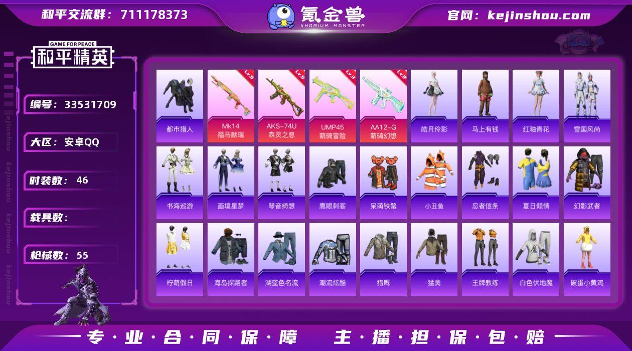 TD2641602无二次安卓 都市猎人 手Q-0粉装-4特效枪-0载具-0粉色飞行器-14599热力值-2王牌印记-46套装-55枪皮 【热门品类】:套装-都市猎人,套装-小丑鱼,套装-忍者信条 【粉色枪皮等级】:UMP45-萌骑冒险(三级),AKS-74U-森灵之息(五级),Mk14-福马献瑞(五级),AA12-G-萌骑幻想(二级) 【粉色枪皮】:UMP45-萌骑冒险,AKS-74U-森灵之息,Mk14-福马献瑞,AA12-G-萌骑幻想 【粉色降落伞】:绝对恒星降落伞,幻影战神降落伞,梦幻火箭降落伞,炫彩糖果降落伞 【稀有套装】:套装-雪国风尚,套装-马上有钱,套装-书海巡游,套装-画境星梦,套装-琴音绮想,套装-雨过天青,套装-红釉青花,角色-皓月伶影 【稀有枪皮】:AUG-冰晶雪宝,AKM-龙的传人,SCAR-L-夜灯,SCAR-L-玉兔迎春,AUG-幻影战神,ACE32-画境星梦,UZI-幻影战神,UZI-影袭,UMP45-夜灯,汤姆逊-幻影战神,汤姆逊-环太平洋,汤姆逊-像素花束,MP5K-画境星梦,Kar98K-幻影战神,M24-炫彩节奏,SKS-迅猛狂鲨,Mini14-梦幻火箭,M1加兰德-画境星梦,S686-生命誓言,S12K-夜灯,S12K-幻影战神,AA12-G-画境星梦,平底锅-画境星梦 【其他套装】:套装-夏日倾情,套装-幻影武者,套装-柠萌假日,套装-海岛探路者,套装-湖蓝...