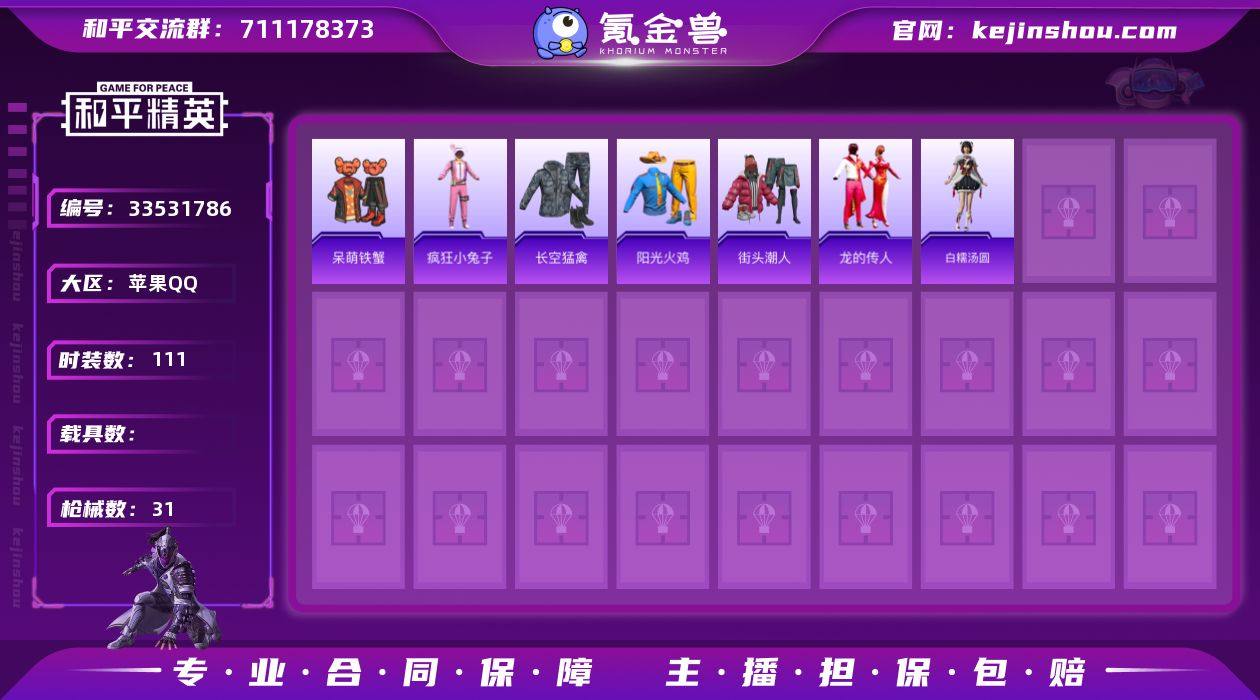 XQ1277+【3特效枪 2淘汰效果 暮夜私语 角色阿虎 角色X 角色魂电 角色奈斯 雨过天青 红釉青花 青翼流星 白糯汤圆 龙的传人 迅捷龙虾 狙击之神 ss37特训 元素星魂 疯狂小兔子 阳光火鸡 可二次】苹果Q区-3特效枪-7004热力值-20套装-31枪皮【稀有武器皮肤】: AKM-影袭 SCAR-L-夜灯 AUG-耀粉歌者 AUG-甜蜜菠萝 QBZ-洛神天依 Mk47-洛神天依 蜜獾-天降萌叽 AWM-天降萌叽 SKS-炫彩节奏 UZI-炫彩节奏 S12K-夜灯【其他套装】: 白糯汤圆 元素星魂 龙的传人 阳光火鸡 长空猛禽 街头潮人 疯狂小兔子 呆萌铁蟹【优质降落伞】: 普通降落伞 勇者同行降落伞