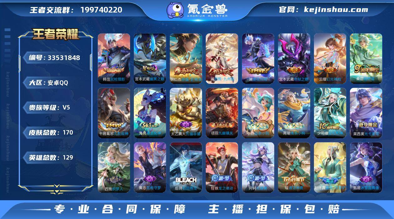 【金标蒙犽】贵族等级: V5 英雄数: 129 皮肤数: 170 荣耀水晶: 弑枪猎影 星传说: 幽冥之眼 传说皮: 久胜战神,地狱之眼,澜逐花归海,幻光神枪,神骥·赴朔漠 限定皮: 李小龙,鸣野蒿,愿照·九州拓