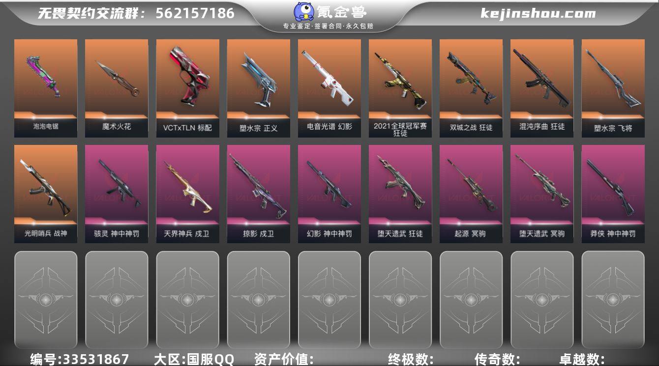 【套装】:2021全球冠军赛套装,ORA x 颗秒套装,末日泡泡套装,神中神罚套装 【英雄】:幻棱,炼狱,维斯,暮蝶,钛狐,壹决,铁臂,捷风,雷兹,幽影,不死鸟,贤者,猎枭,蝰蛇,零,芮娜,奇乐,尚勃勒,霓虹,斯凯,夜露,星礈,K/O,海神,盖可,黑梦,钢锁 【近战武器】:近战武器-2021全球冠军赛 爪刀,近战武器-ORA x 颗秒 军刀,近战武器-泡泡电锯,近战武器-魔术火花,近战武器-神之刃,近战武器-鬼丸国纲,近战武器-珍珠棘贝 短剑,近战武器-钢轨卫士 战锤,近战武器-沙尘幻旅 匕首,近战武器-影刃,近战武器-魔术火花 【狂徒】:狂徒-2021全球冠军赛,狂徒-归零者,狂徒-混沌序曲,狂徒-双城之战,狂徒-ORA x 颗秒,狂徒-堕天遗武,狂徒-钢轨卫士,狂徒-沙尘幻旅 【幻影】:幻影-电音光谱,幻影-末日泡泡,幻影-ORA x 颗秒,幻影-神中神罚,幻影-珍珠棘贝,幻影-战术小伙伴,幻影-电音光谱 【戍卫】:戍卫-掠影,戍卫-天界神兵,戍卫-钢轨卫士,戍卫-珍珠棘贝,戍卫-萌彩剪影 【獠犬】:獠犬-复古浪潮,獠犬-胡桃狂想,獠犬-战术小伙伴 【冥驹】:冥驹-末日泡泡,冥驹-ORA x 颗秒,冥驹-堕天遗武,冥驹-起源,冥驹-复古浪潮,冥驹-胡桃狂想 【飞将】:飞将-塑水...