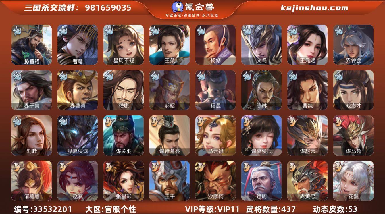 VIP等级: VIP11 官阶: 大将军 武将数量: 437 动态皮肤数量: 53 魏国武将: 刘晔,戏志才,曹纯,陈琳,程昱,郝昭,嵇康,界曹真,界于禁,界钟会,王元姬,文鸯,杨修,王粲,星周不疑,界夏侯渊,曹髦,势董昭 蜀国武将: 花鬘,界黄忠,谯周,沙摩柯,王平,张星彩,赵襄,诸葛瞻,谋马超,谋赵云,谋夏侯氏,马云騄,谋诸葛亮,谋关羽 吴国武将: 贺齐,界步练师,界徐盛,界朱然,骆统,孙寒华,吴景,周处,文鸯,势太史慈 群国武将: 卑弥呼,公孙康,界左慈,沮授,麹义,士燮,苏飞,陶谦,兀突骨,许攸,杨彪,张让,左慈,界沮授,谋张角,势于吉
