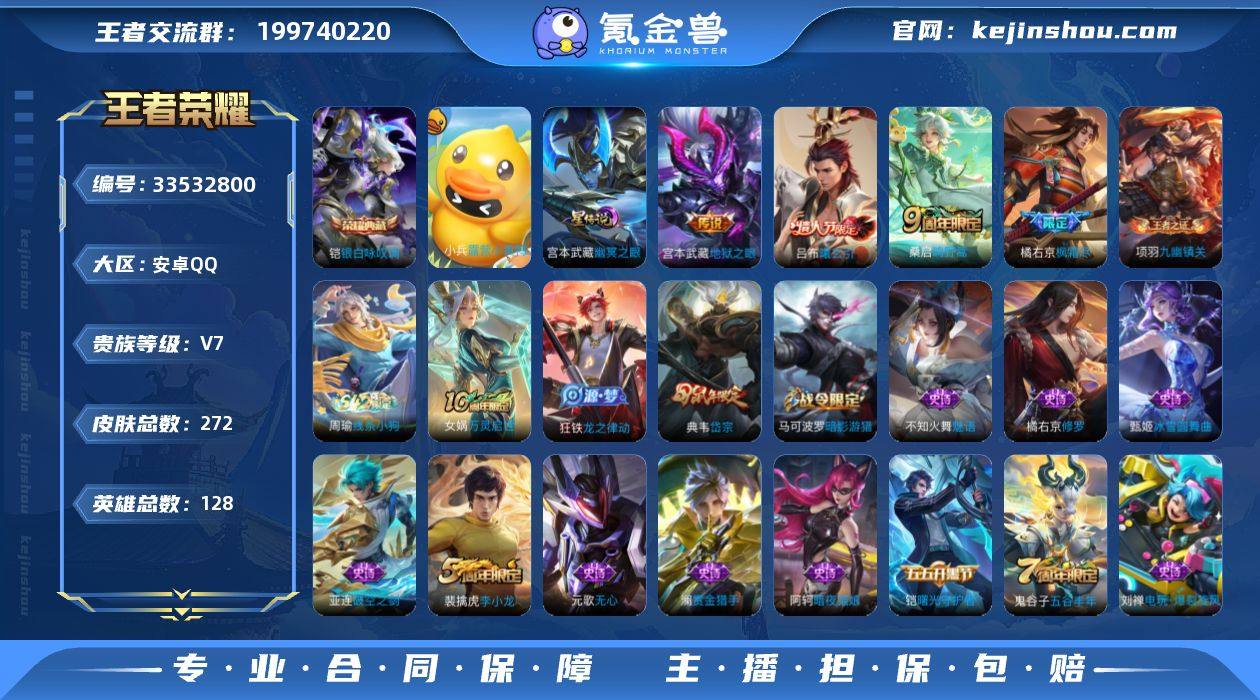 王者20947,1小兵皮,小黄鸭,1星传说,金标典韦8893战力,安卓Q-V7-永恒钻石IV段位-128英雄-272皮肤-1典藏皮肤-4传说-67史诗 【英雄全皮】:孙权全皮,橘右京全皮 【荣耀典藏】:铠银白咏叹调 【传说皮肤】:桑启鸣野蒿,吕布曦玄引,橘右京枫霜尽,宫本武藏地狱之眼 【限定皮肤】:蔡文姬夏日便利店,虞姬夏日便利店,姜子牙天穹之誓,狄仁杰阴阳师,赵云皇家上将,嬴政优雅恋人,孙尚香蔷薇恋人,庄周高山流水,钟无艳超时空战士,扁鹊奇幻香踪,芈月幻夜卜梦,元歌无心,甄姬游园惊梦,甄姬落雪兰心,典韦岱宗,马可波罗暗影游猎,狄仁杰魔术师,狄仁杰万华元夜,达摩沙漠行僧,项羽海滩派对,老夫子醍醐杖,程咬金演武夺筹,兰陵王金庭之子,橘右京枫霜尽,后羿圣弓游侠,李元芳云中旅人,钟馗驱傩正仪,杨戬潮玩骑兵,干将莫邪真爱魔法,雅典娜黎明之约,鬼谷子原初探秘者,鬼谷子五谷丰年,黄忠火炮绅士,苏烈千军破阵,百里玄策原初追逐者,梦奇顽趣,沈梦溪大漠名商,明世隐疑决卦,裴擒虎李小龙,裴擒虎擒涛扼浪,云中君纤云弄巧,上官婉儿梁祝,嫦娥暖冬兔眠,鲁班大师探海日志,桑启海盐诗旅,暃星界游侠,艾琳女武神,阿古朵江河有灵,张良古海寻踪,蒙恬荣光圣...