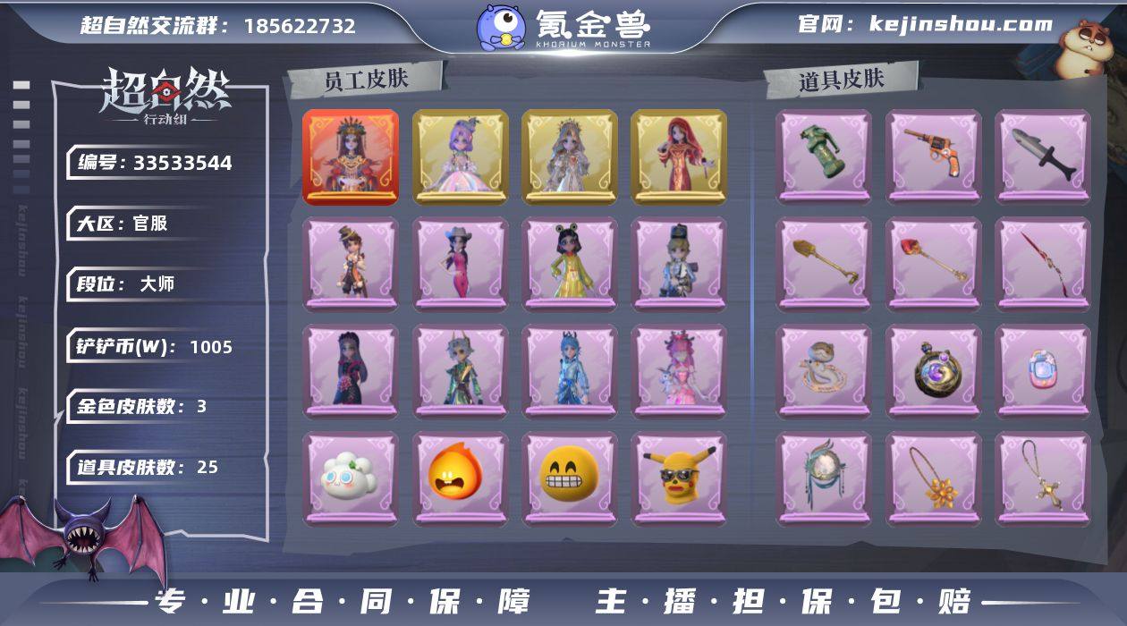 金色皮肤数量: 3 紫色皮肤数量: 8 道具皮肤数量: 25 段位: 大师 员工: 逍遥,薇薇安,巫铃儿,莉莉,阿念,艾伦,小黄,零,爱丽丝,爱德华,兰,小满,临云 外观: 镜生遗梦,遗失的童话,圣光之谕,镜花辞,王子与骑士,丝缕哀歌,泽引山海,水王子,情公主,嘻嘻头套,烈焰红唇头套,呆滞头套,炙热烧烤,卑微头套,哈士奇头套,滑稽头套,鳄霸天头套,鱼头怪头套,面具马头套,萨卡班甲鱼头套,云梦之星,天使的呼唤,蝶恋花,小鲨包包,未竟乐园,天使消失的年代,钗头凤,呱呱雨衣,九色祥鹿,火爆了头套,耀眼的你,庆宴绮愿,不朽的今夜,牛啤背包,饺饺者头套,孤独对望