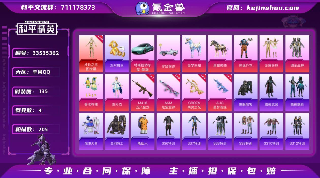 苹果【极品神装号 沙丘之主-图卡盟(二级),粉装-怪诞乔克,套装-浪漫天命,套装-派对舞王,套装-金羽特工,角色-洛天依,AKM-暮色玫影(三级),M416-五爪金龙(七级),特斯拉Roadster(水滴蓝),灵鼠银迹,萌熊伴侣背包(3级)】 手Q-1神装-5粉装-7特效枪-4载具-8粉色飞行器-71685热力值-12王牌印记-135套装-205枪皮 【红色神装等级】:沙丘之主-图卡盟(二级) 【红色角色神装】:沙丘之主-图卡盟 【热门品类】:粉装-怪诞乔克,套装-浪漫天命,套装-派对舞王,套装-金羽特工,套装-龟仙人 【粉色套装】:粉装-怪诞乔克,粉装-金属狂野,粉装-绚金战神,粉装-香水柠檬,角色-洛天依 【粉色枪皮等级】:AKM-炫紫旋律(六级),AKM-暮色玫影(三级),M416-五爪金龙(七级),GROZA-精灵之光(三级),AUG-星梦奇缘(三级),AKS-74U-森灵之息(五级),Mk14-福马献瑞(五级) 【粉色载具】:特斯拉Roadster(水滴蓝),灵鼠银迹,星梦玉骢,黑曜夜骑 【粉色枪皮】:AKM-炫紫旋律,AKM-暮色玫影,M416-五爪金龙,GROZA-精灵之光,AUG-星梦奇缘,AKS-74U-森灵之息,Mk14-福马献瑞 【粉色飞行器】:香车宝马飞行器,梦幻火箭飞行器,沙丘之主天马,星梦奇缘飞行器,曦光华影飞行器,终晖之翼飞行器,...