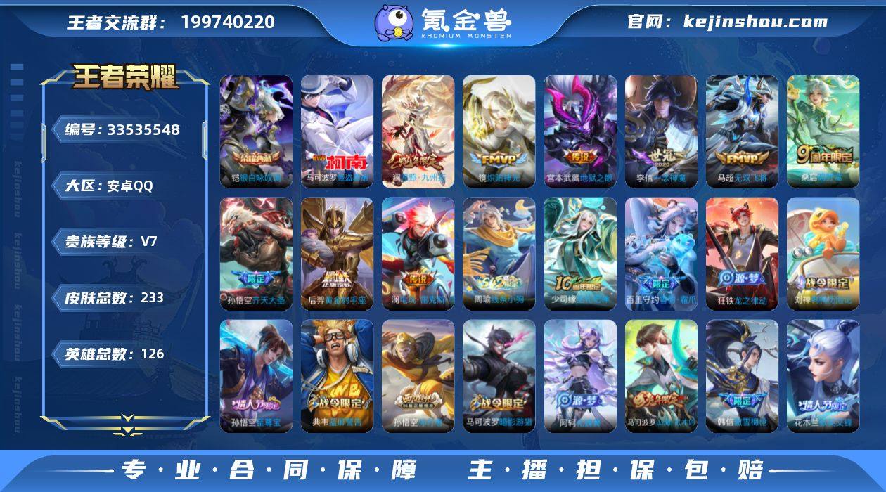 【精品号手慢无】皮233V7,王者印记9个,1星传说,16按键,2签名,1点藏。1珍品,9传说,荣耀水晶1个:银白咏叹调,怪盗基德,炽阳神光,一念神魔,至尊宝,默契交锋-花木兰,愿照·九州拓,器灵·浮梦炉,星币2662个。