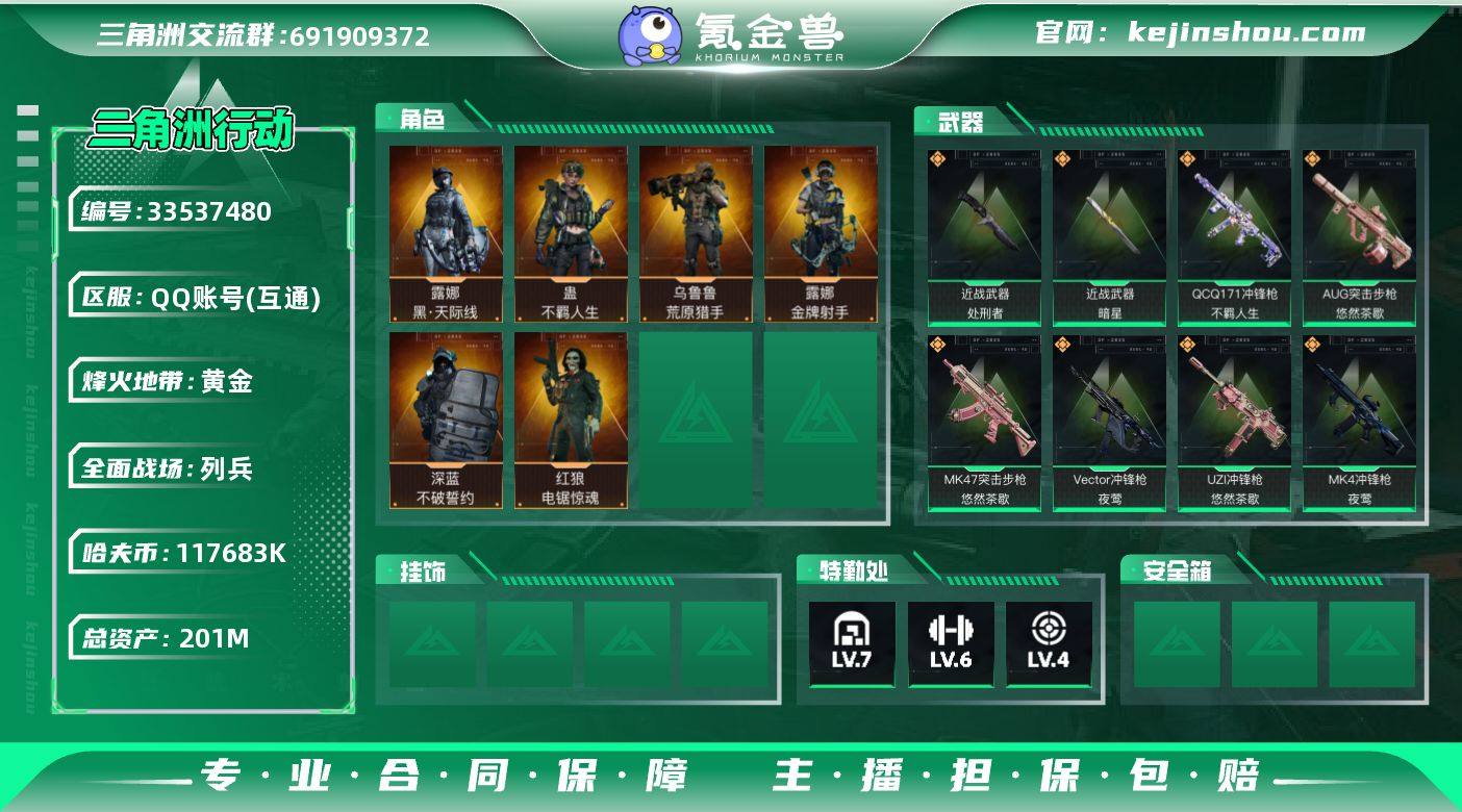 【sjz7063】201m总资产-117683k哈夫币-60烽火等级-黄金-35战场等级-列兵 【干员外观】:露娜-黑·天际线,深蓝-不破誓约,红狼-电锯惊魂,露娜-金牌射手,乌鲁鲁-荒原猎手,蛊-不羁人生 【近战皮肤】:近战-暗星,近战-处刑者1级,近战-黑鹰 【传说外观】:M4A1突击步枪-阿米娅,AKM突击步枪-锦绣,QBZ95-1突击步枪-凌霄戍卫,ASh-12战斗步枪-鹅鸭杀,K416突击步枪-行动记录,M16A4突击步枪-狩猎时刻,AUG突击步枪-悠然茶歇,SG552突击步枪-运动员,SCAR-H战斗步枪-启航,G3战斗步枪-狩猎时刻,CAR-15突击步枪-阿米娅,腾龙突击步枪-捞点薯条,K437突击步枪-锦绣,MK47突击步枪-悠然茶歇,MK47突击步枪-暗星,Vector冲锋枪-狩猎时刻,Vector冲锋枪-能天使-午夜邮差,Vector冲锋枪-夜莺,UZI冲锋枪-悠然茶歇,SMG-45冲锋枪-锦绣,SR-3M紧凑突击步枪-暗星,勇士冲锋枪-能天使-午夜邮差,QCQ171冲锋枪-鹅鸭杀,QCQ171冲锋枪-不羁人生,MK4冲锋枪-夜莺,M250通用机枪-骑士之心,QJB201轻机枪-鹅鸭杀,Mini-14射手步枪-夜莺,M14射手步枪-蛮荒,M14射手步枪-缄花,SR-25射手步枪-缄花,R93狙击步枪-维什戴尔,AWM狙击步枪-捞点薯条,.357左轮-缄花,93R-捞点薯条,复合弓-黑·天际线...