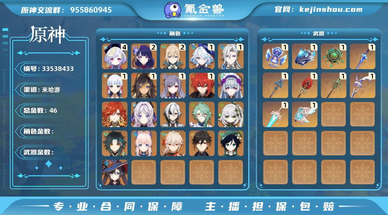 邮箱: 未绑定 总黄数: 46 冒险等级: 60 4命金色角色: 四命七七 2命金色角色: 二命琴,二命雷电将军 1命金色角色: 一命迪卢克,一命神里绫华,一命刻晴,一命迪希雅,一命那维莱特,一命芙宁娜 0命金色角色: 温迪,枫原万叶,钟离,莫娜,魈,珊瑚宫心海,纳西妲,白术,阿蕾奇诺,玛薇卡,茜特菈莉,梦见月瑞希 1精武器: 天空之卷,和璞鸢,阿莫斯之弓,天空之傲,护摩之杖,息灾,波乱月白经津,碧落之珑,万世流涌大典,祭星者之望