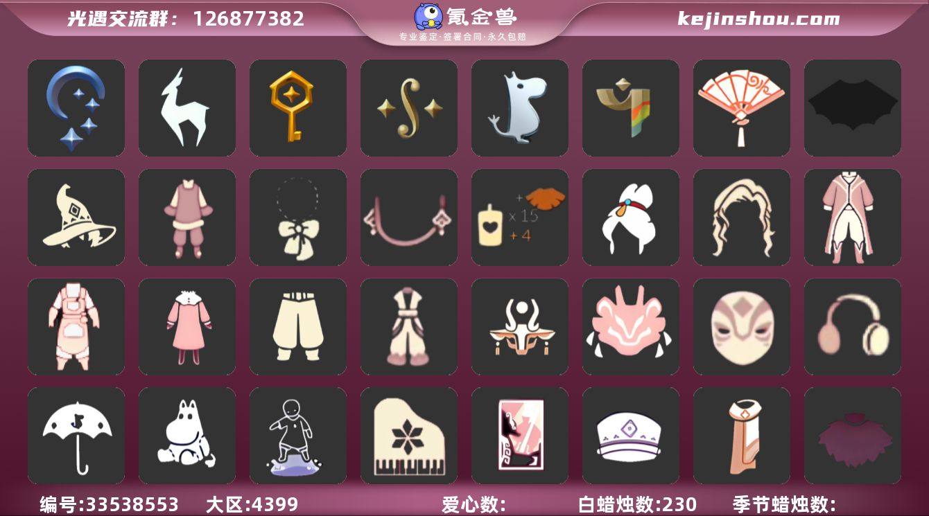 安卓官服 手机账号 6毕业季 230蜡烛 【季节已毕业】夜行季,九色鹿(九色鹿季),筑巢季,二重奏季,姆明季,彩染季 【礼包】新年裤(瑞气服饰),蝴蝶结(大蝴蝶结),巫师(巫师帽),新年耳钉(金鳞耳饰),创始人(创始人斗篷),线框斗篷礼包(周年线框斗篷),蝙蝠套(蝙蝠斗篷)(南瓜头),献瑞折扇礼包 【裤子】筑巢季·裤子(设计师长袍),青鸟尊贵蓬头裤子(蓝色燕尾服),飞天裤(柔缎花边连)(九色鹿丝带裤),妮妮裙子(妮妮长裙),武士裤 【面具】夜行毕业面具(棕熊面具),辉光羚羊面具,九色鹿面具 【面饰】青鸟毕业面饰(青鸟面饰),红耳机 【发型】飞天盘发(九色鹿丸子头),虚荣 【头饰】平顶帽 【斗篷】粉红绒毛斗篷(绒毛斗篷),彩染围巾斗篷,绿芽,海洋斗 【配饰】小红伞(姆明红伞)(姆明大伞),姆明抱枕,二重奏挂画(合奏挂画),筑巢季·小手办(光之子试衣),高音钢琴(白色高脚钢琴)
