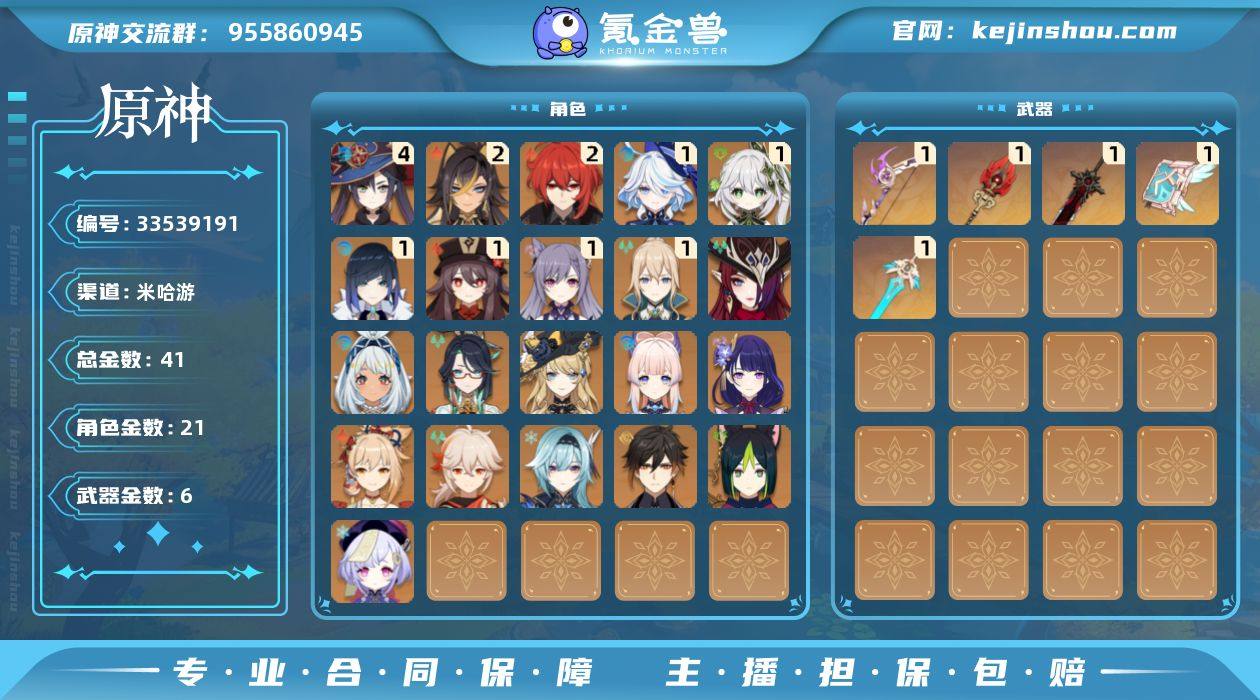 58级/41黄/男主/21个五星角色/6个五星武器 0命闲云,0命娜维娅,1命芙宁娜,2命迪希雅,1命纳西妲,0命提纳里,1命夜兰,0命优菈,0命雷电将军,0命枫原万叶,0命钟离,1命胡桃,0命宵宫,0命珊瑚宫心海,1命刻晴,0命七七,1命琴,4命莫娜,2命迪卢克,0命玛拉妮,0命恰斯卡,精1飞雷之弦振,精1护摩之杖,精1天空之刃,精1天空之卷,精1狼的末路