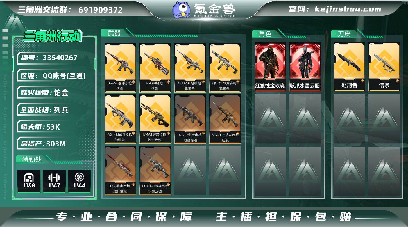 【932202】[16824228]实名: 不可修改 烽火地带段位: 铂金 全面战场段位: 列兵 总资产: 303 哈夫币: 53 干员外观: 红狼-蚀金玫瑰,骇爪-水墨云图 传说武器皮肤: M4A1突击步枪-蚀金玫瑰,SCAR-H战斗步枪-水墨云图,R93狙击步枪-维什戴尔,SCAR-H战斗步枪-启航,ASh-12战斗步枪-鹅鸭杀,QCQ171冲锋枪-鹅鸭杀,QJB201轻机枪-鹅鸭杀,KC17突击步枪-电锯惊魂,近战-信条,P90冲锋枪-信条,SR-25射手步枪-信条,SKS射手步枪-骑士,近战-处刑者,M14射手步枪-蛮荒