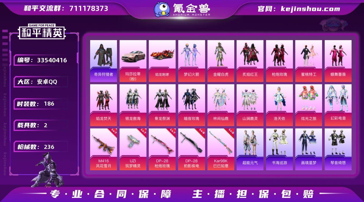 安卓 手Q-15粉装-7特效枪-2载具-3粉色飞行器-84945热力值-16王牌印记-186套装-236枪皮 【热门品类】:粉装-梦幻火箭,套装-奇异狩猎者,套装-龟仙人 【粉色套装】:粉装-金曜白虎,粉装-梦幻火箭,粉装-炙焰红王,粉装-枪炮玫瑰,粉装-蜜桃特工,粉装-蝶舞蔷薇,粉装-焰龙焚天,粉装-银龙傲海,粉装-骨龙祭渊,粉装-暗夜玫瑰,粉装-林间仙鹿,粉装-山涧鹿灵,角色-洛天依,粉装-炫光之旅,粉装-幻彩电音 【粉色枪皮等级】:M416-风花雪月(七级),UZI-筑梦精灵(七级),UMP45-萌骑冒险(五级),AKS-74U-森灵之息(五级),Kar98K-巳巳如意(五级),DP-28-枪炮玫瑰(七级),DP-28-豹影疾电(五级) 【粉色载具】:玛莎拉蒂Ghibli(粉),焰龙咆哮 【粉色枪皮】:M416-风花雪月,UZI-筑梦精灵,UMP45-萌骑冒险,AKS-74U-森灵之息,Kar98K-巳巳如意,DP-28-枪炮玫瑰,DP-28-豹影疾电 【粉色飞行器】:炫彩糖果飞行器,梦幻火箭飞行器,焰龙焚天飞行器 【粉色降落伞】:绝对恒星降落伞,凝视深渊降落伞,梦幻火箭降落伞,四圣焕新降落伞,童趣迷兔降落伞,枪炮玫瑰降落伞,焰龙焚天降落伞,暗夜玫瑰降落伞,林间仙鹿降落伞,洛神天依降落伞,筑梦精灵降落伞,环太平洋降落伞,垂柳戏鸭降落...