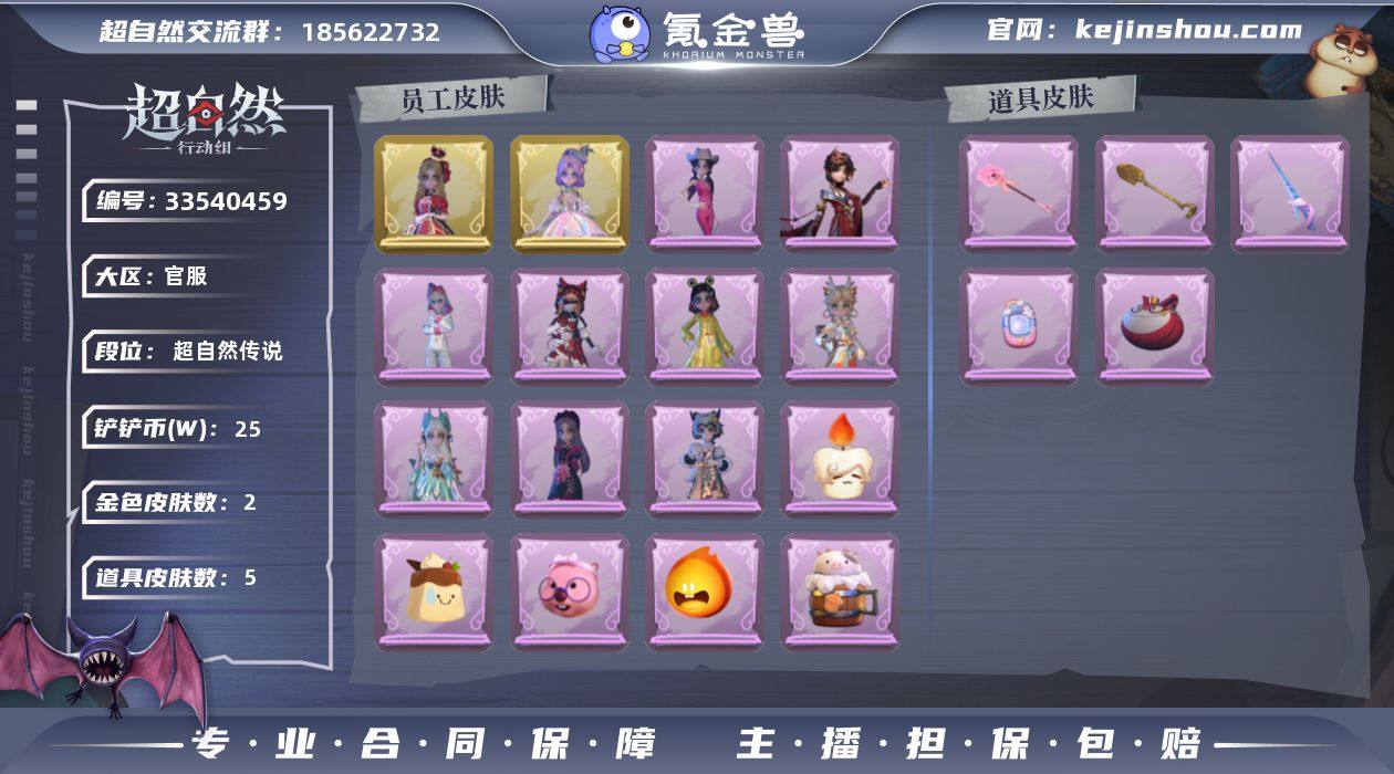金色皮肤数量: 2 紫色皮肤数量: 9 道具皮肤数量: 5 段位: 超自然传说 外观: 血色中的玛丽,遗失的童话,灵昭鹿鸣,瑞羽衔春,丝缕哀歌,霓裳踏雪,云梦之星,兔先生的时钟,小鲨包包,未竟乐园,小小玛丽,呱呱雨衣,火爆了头套,精致露比头套,莓果陷阱,潮汐小海兔,糖果守卫,绒绒对决,樱桃奶油布丁,仙锋小姐,耀眼的你,烛光纪念,牛啤背包
