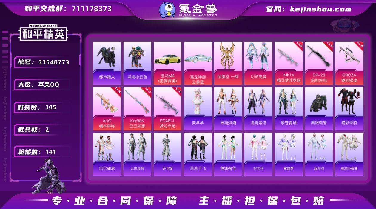 【949974】苹果 手Q-2粉装-6特效枪-2载具-2粉色飞行器-40049热力值-9王牌印记-105套装-141枪皮 【热门品类】:套装-都市猎人,套装-深海小丑鱼,套装-暗影哥特,M416-星际漫游 【粉色套装】:角色-凤凰座 一辉,粉装-幻彩电音 【粉色枪皮等级】:SCAR-L-梦幻火箭(二级),GROZA-镜光银凌(五级),AUG-暖羊咩咩(五级),Kar98K-巳巳如意(五级),Mk14-精灵梦叶罗丽(六级),DP-28-豹影疾电(五级) 【粉色载具】:宝马M4(圣保罗黄),霜龙神御(云雾蓝) 【粉色枪皮】:SCAR-L-梦幻火箭,GROZA-镜光银凌,AUG-暖羊咩咩,Kar98K-巳巳如意,Mk14-精灵梦叶罗丽,DP-28-豹影疾电 【粉色飞行器】:梦幻火箭飞行器,灵猫魔法师飞行器 【粉色降落伞】:梦幻火箭降落伞,垂柳戏鸭降落伞,湮灭星辰降落伞,时光之吻降落伞,无垠阁降落伞 【稀有套装】:套装-巳巳如意,套装-云鹰凌岚,角色-许七安,套装-燕燕于飞,套装-鱼渊荷华,套装-粉恋花,套装-紫幽梦,套装-蓝冰羽,套装-星渊小夜曲,套装-虚空漩涡,套装-彩虹兔,套装-云朵鹅,套装-雪绒豹,角色-灵公主,套装-蓝海鲸歌,套装-朱霞炽焰,套装-凌霄紫焰,套装-擎苍青焰,玩偶服-美羊羊 【稀有枪皮】:AKM-彩虹符号,AKM-影袭,AKM-缤纷...