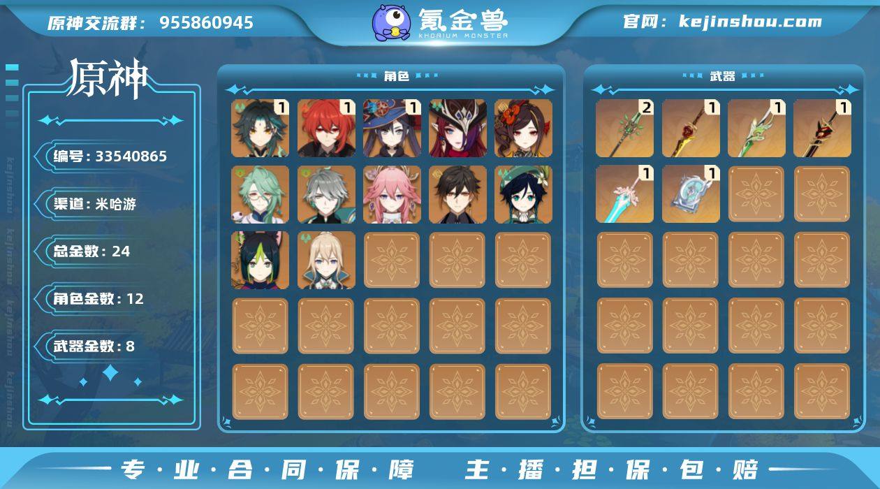 58级/24黄/男主/12个五星角色/8个五星武器 0命千织,0命白术,0命艾尔海森,0命提纳里,0命八重神子,0命钟离,1命魈,0命温迪,0命琴,1命莫娜,1命迪卢克,0命恰斯卡,精1有乐御簾切,精1裁叶萃光,精1赤角石溃杵,精1四风原典,精2和璞鸢,精1天空之傲