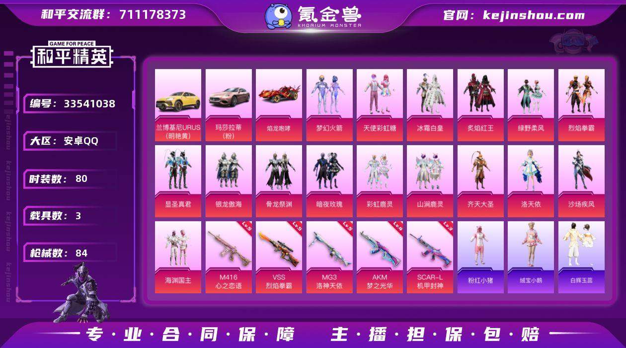 【949978】安卓 手Q-16粉装-5特效枪-3载具-2粉色飞行器-40509热力值-5王牌印记-80套装-84枪皮 【热门品类】:粉装-梦幻火箭,套装-粉红小猪 【粉色套装】:粉装-天使彩虹糖,粉装-梦幻火箭,粉装-冰霜白皇,粉装-炙焰红王,粉装-绿野柔风,粉装-烈焰拳霸,粉装-显圣真君,粉装-银龙傲海,粉装-骨龙祭渊,粉装-暗夜玫瑰,粉装-彩虹鹿灵,粉装-山涧鹿灵,粉装-齐天大圣,角色-洛天依,粉装-沙场疾风,粉装-海渊国主 【粉色枪皮等级】:AKM-梦之光华(四级),SCAR-L-机甲封神(三级),M416-心之恋语(五级),VSS-烈焰拳霸(五级),MG3-洛神天依(五级) 【粉色载具】:兰博基尼URUS(明艳黄),玛莎拉蒂Ghibli(粉),焰龙咆哮 【粉色枪皮】:AKM-梦之光华,SCAR-L-机甲封神,M416-心之恋语,VSS-烈焰拳霸,MG3-洛神天依 【粉色飞行器】:梦之光华飞行器,齐天大圣飞行器 【粉色降落伞】:百万伏特降落伞,凝视深渊降落伞,梦幻火箭降落伞,童趣迷兔降落伞,烈焰拳霸降落伞,葫芦兄弟降落伞,暗夜玫瑰降落伞,齐天大圣降落伞,洛神天依降落伞,风花雪月降落伞,海渊国主降落伞 【稀有套装】:套装-绒宝小鹅,套装-白辉玉蕊,套装-蓝冰羽 【稀有枪皮】:AKM-彩虹符号,AKM-海渊国主,AKM...