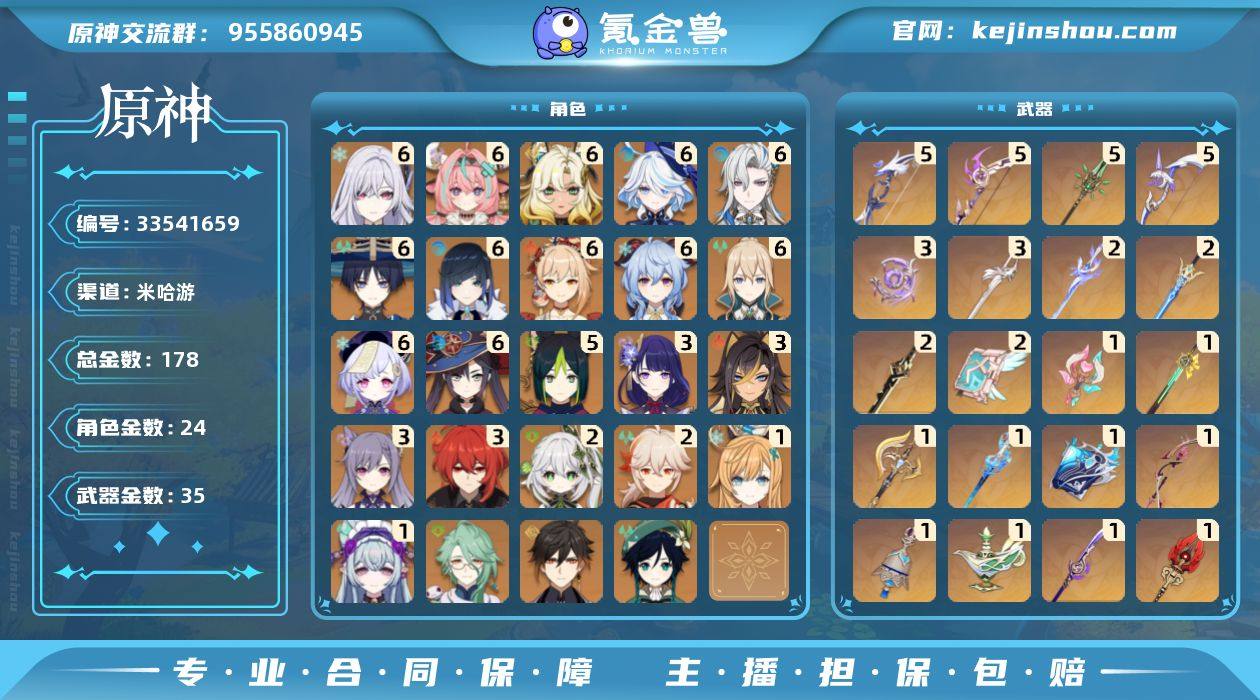 【952817】60级/178黄/女主/24个五星角色/35个五星武器 满命芙宁娜,满命那维莱特,0命白术,3命迪希雅,满命流浪者,2命纳西妲,5命提纳里,满命夜兰,3命雷电将军,2命枫原万叶,0命钟离,满命甘雨,满命宵宫,0命温迪,3命刻晴,满命七七,满命琴,满命莫娜,3命迪卢克,满命希诺宁,1命梦见月瑞希,满命瓦雷莎,1命爱可菲,满命丝柯克,精1裁断,精1静水流涌之辉,精1万世流涌大典,精1最初的大魔术,精1图莱杜拉的回忆,精1千夜浮梦,精5若水,精1终末嗟叹之诗,精3不灭月华,精1薙草之稻光,精5飞雷之弦振,精2苍古自由之誓,精1护摩之杖,精1四风原典,精5和璞鸢,精1天空之脊,精1天空之翼,精5阿莫斯之弓,精1天空之刃,精2斫峰之刃,精2天空之卷,精3风鹰剑,精1狼的末路,精1天空之傲,精1岩峰巡歌,精1溢彩心念,精2苍耀