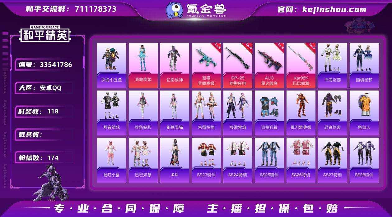 安卓 手Q-3粉装-7特效枪-0载具-1粉色飞行器-46782热力值-4王牌印记-118套装-174枪皮 【热门品类】:套装-深海小丑鱼,角色-军刀雅典娜,套装-忍者信条,套装-龟仙人,套装-粉红小猪 【粉色套装】:粉装-幻影战神,角色-异瞳寒姬,角色-鸢尾珑雾 【粉色枪皮等级】:AUG-星之彼岸(五级),蜜獾-异瞳寒姬(五级),UMP45-萌骑冒险(四级),AKS-74U-森灵之息(五级),Kar98K-巳巳如意(五级),Mk14-福马献瑞(五级),DP-28-豹影疾电(五级) 【粉色枪皮】:AUG-星之彼岸,蜜獾-异瞳寒姬,UMP45-萌骑冒险,AKS-74U-森灵之息,Kar98K-巳巳如意,Mk14-福马献瑞,DP-28-豹影疾电 【粉色飞行器】:炫彩糖果飞行器 【粉色降落伞】:绝对恒星降落伞,星之彼岸降落伞,精灵梦叶罗丽降落伞,幻彩电音降落伞,异瞳寒姬降落伞,炫彩糖果降落伞 【稀有套装】:套装-龟仙人,套装-巳巳如意,套装-雪国风尚,套装-炫彩糖果,套装-马上来财,套装-迅捷龙虾,套装-遗迹猎人,角色-风玲,套装-朱霞炽焰,套装-凌霄紫焰,角色-绯色魅影,角色-紫俏灵猫,套装-书海巡游,套装-画境星梦,套装-琴音绮想,套装-雨过天青,套装-红釉青花,角色-孙斩天,角色-枫露凝珀,套装-锦灰蝶梦,套装-燕雀桃枝 【稀有枪皮】...