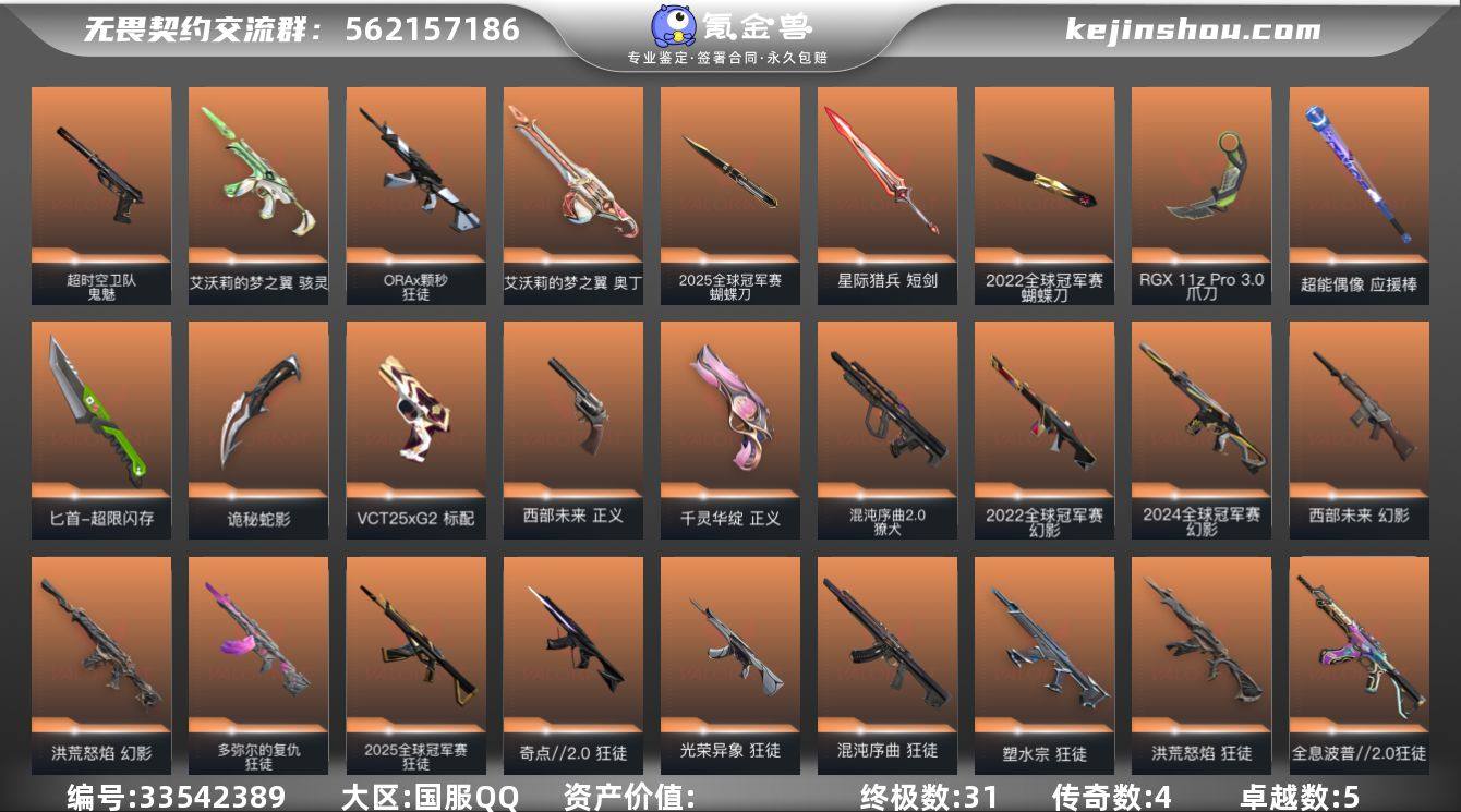 【6.7万库存.25冠军套.22冠军套.24冠军幻影.显卡爪刀.紫金爪刀.剥皮小刀.黑波.混沌多弥尔.颗秒.盖亚.塑水宗.混沌】YXy6942【无二次】【因赛季更新游戏段付以上号为准] 【套装】:2025全球冠军赛套装,2022全球冠军赛套装,西部未来套 【英雄】:幻棱,炼狱,维斯,暮蝶,钛狐,壹决,铁臂,捷风,雷兹,幽影,不死鸟,贤者,猎枭,蝰蛇,零,芮娜,奇乐,尚勃勒,霓虹,斯凯,夜露,星礈,K/O,海神,盖可,黑梦,钢锁 【近战武器】:近战武器-2025全球冠军赛 蝴蝶刀,近战武器-2022全球冠军赛 蝴蝶刀,近战武器-碎心裂刃,近战武器-剥皮小刀,近战武器-紫金爪刀,近战武器-RGX 11z Pro//3.0 爪刀,近战武器-黑波之刃,近战武器-未来开拓者,近战武器-超能偶像 应援棒,近战武器-超限闪存 匕首,近战武器-诡秘蛇影 军刀,近战武器-星际猎兵 短剑 【狂徒】:狂徒-2025全球冠军赛,狂徒-洪荒怒焰,狂徒-混沌序曲,狂徒-奇点//2.0,狂徒-全息波普//2.0,狂徒-塑水宗,狂徒-光荣异象,狂徒-多弥尔的复仇,狂徒-ORA x 颗秒,狂徒-盖亚的复仇,狂徒-日冕雄师,狂徒-超能偶像,狂徒-诡秘蛇影 【幻影】:幻影-2022全球冠军赛,幻影-2024全球冠军赛,幻影-洪荒怒焰,幻影-西部未来,幻...
