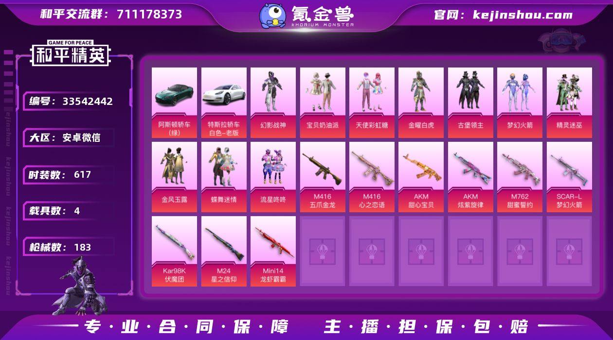 [18830924]10粉装 9特效枪 4载具 2印记 可二次 可修改实名 【热门装扮】奇异狩猎者,梦幻火箭(新101) ,金曜白虎,天使彩虹糖,蝶舞迷情,幻影战神,宝贝奶油派,金风玉露,古堡领主,精灵迷巫,流星咚咚,软萌银虎,蔷薇魔法师,奇迹天团,激萌罗小黑,大橘为重,仓鼠灰灰,暴走罗小黑,迅捷狂鲨,呆萌铁蟹,深海小丑鱼,浪漫波比 【载具】玛莎拉蒂Ghibli(粉),玛莎拉蒂Ghibli(蓝),特斯拉Model X(珍珠白),阿斯顿·马丁DBS(绿) 【稀有枪皮】M416五爪金龙,M416心之恋语,AKM甜心宝贝,SCAR-L梦幻火箭,M762甜蜜誓约,Kar98K伏魔团,M24星之信仰,Mini14龙虾霸霸,AKM炫紫旋律 【七级特效枪】七级M416-五爪金龙,七级AKM-甜心宝贝,七级Mini14-龙虾霸霸 【五级特效枪】五级M416-心之恋语 【四级特效枪】四级AKM-炫紫旋律,四级SCAR-L-梦幻火箭 【三级特效枪】三级Kar98K-伏魔团,三级M24-星之信仰 【一级特效枪】一级M762-甜蜜誓约 【紫色装扮】游乐,沙漠兵团,格斗先锋,探宝勇士,夏日音浪,凛冬战士,刚毅裁决者,北国孤狼,千禧之恋,吉莉礼服,圣诞大吉,怒火燎原,战地名士,甜蜜告白,甜蜜熊情侣,疯狂小兔子,白熊同盟,神秘领域,福星高照,竞技勇士朋克,灼焰舞者,滨海假日,滨海厨神,灰色守护者,灰色格斗者,熔岩使者,牛气冲...