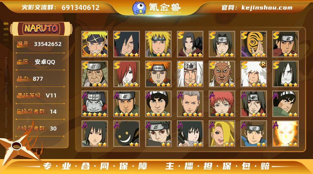 14S级忍者数-30A级忍者数 【S级忍者】:长门「秽土转生」(3星),猿飞日斩「秽土转生」(3星),宇智波鼬「秽土转生」(3星),宇智波斑「秽土转生·解」(3星),宇智波鼬「须佐能乎」(3星),艾「四代目雷影」(3星),自来也(3星),自来也「舞之豪杰」(3星),大蛇丸(3星),千手柱间(3星),波风水门(3星),神秘面具男(3星),佩恩「天道」(3星),漩涡鸣人·宇智波佐助(3星) 【A级忍者】:迪达拉(2星),迪达拉「秽土转生」(2星),迪达拉「晓创生」(2星),大蛇丸「晓」(2星),飞段(4星),飞段「死司凭血」(2星),干柿鬼鲛(5星),漩涡鸣人「仙人模式」(2星),漩涡鸣人「九尾查克拉」(2星),迈特凯(5星),旗木卡卡西「万花筒写轮眼」(2星),桃地再不斩(2星),我爱罗「疾风传」(2星),我爱罗「忍界大战」(2星),蝎(4星),小南(2星),角都「地怨虞」(2星),猿飞阿斯玛(5星),宇智波止水(2星),宇智波鼬(3星),宇智波佐助「须佐能乎」(2星),宇智波佐助「万花筒写轮眼」(2星),照美冥「五代目水影」(2星),黑绝(2星),猿飞木叶丸「博人传」(2星),春野樱「百豪」(2星),秋道丁次「忍界大战」(2星),千代「近松十人卫」(2星),宇智波泉奈(2星),迈特凯「青春爆炸」(2星)