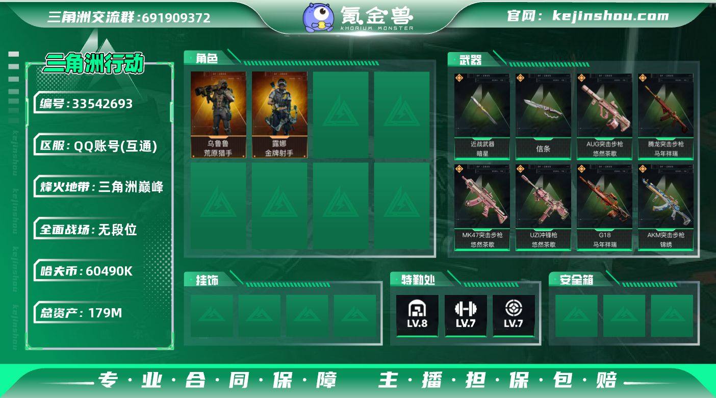 【949718】{特价出售}等级:60总资产:179.8M 纯币60490k 刀皮: 暗星 信条 特勤处:仓库8,训练满,靶场满 部门33332 露娜-金牌射手,乌鲁鲁-荒原猎手