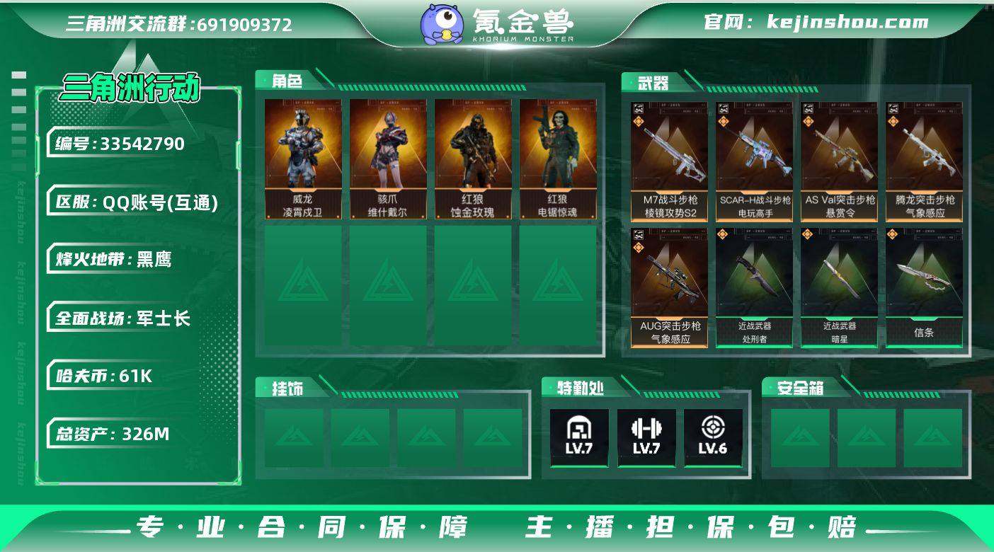 【932704】[17303465]实名: 不可修改 烽火地带段位: 黑鹰 全面战场段位: 军士长 总资产: 326 哈夫币: 61 干员外观: 红狼-蚀金玫瑰,骇爪-维什戴尔,红狼-电锯惊魂,露娜-金牌射手(S7),威龙-凌霄戍卫 传说武器皮肤: 近战-赤枭,M4A1突击步枪-蚀金玫瑰,SCAR-H战斗步枪-电玩高手(典藏),AUG突击步枪-气象感应(典藏),腾龙突击步枪-气象感应(典藏),M4A1突击步枪-阿米娅,CAR-15突击步枪-阿米娅,M7战斗步枪-棱镜攻势S2(典藏),M14射手步枪-电锯惊魂,R93狙击步枪-维什戴尔,SCAR-H战斗步枪-启航,ASh-12战斗步枪-鹅鸭杀,QCQ171冲锋枪-鹅鸭杀,QJB201轻机枪-鹅鸭杀,KC17突击步枪-电锯惊魂,AS Val突击步枪-悬赏令(典藏),近战-信条,P90冲锋枪-信条,SR-25射手步枪-信条,SG552突击步枪-运动员,SKS射手步枪-骑士,SR-3M紧凑突击步枪-白鹰兵势,MP7冲锋枪-趣味文化,近战-暗星,MK47突击步枪-暗星,SR-3M紧凑突击步枪-暗星,近战-处刑者,QBZ95-1突击步枪-凌霄戍卫,腾龙突击步枪-马年祥瑞,G18-马年祥瑞,Vector冲锋枪-夜莺,MK4冲锋枪-夜莺,Mini-14射手步枪-夜莺,.357左轮-缄花,SR-25射手步枪-缄花,M14射手步枪-缄花,SMG-45冲锋枪-锦绣,K437突击步枪-锦绣,AKM突击步枪-锦绣 亮点: 【优质装备】:近战-赤枭,腾龙突...