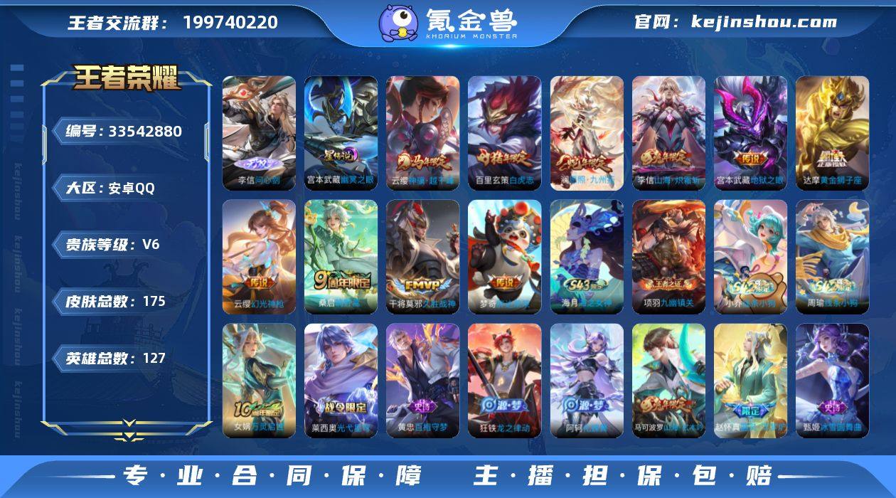 【c4372】安卓Q-V6-【特价出售,永久包赔】李信无双!白虎志!云樱马年!4381星币!至尊星耀V段位-127英雄-175皮肤-1无双-10传说-38史诗 【英雄全皮】:孙权全皮,敖隐全皮,影全皮 【无双皮肤】:李信问心剑 【传说皮肤】:云缨神骥越千峰,澜愿照九州拓,云缨幻光神枪,桑启鸣野蒿,李信山海炽霜斩,干将莫邪久胜战神,达摩黄金狮子座,百里玄策白虎志,梦奇胖达荣荣,宫本武藏地狱之眼 【限定皮肤】:姜子牙天穹之誓,狄仁杰阴阳师,赵云皇家上将,高渐离玩趣恶龙,马可波罗山海玄木吟,狄仁杰魔术师,项羽海滩派对,李元芳云中旅人,雅典娜黎明之约,百里玄策白虎志,裴擒虎擒涛扼浪,李信山海炽霜斩,上官婉儿梁祝,鲁班大师探海日志,桑启海盐诗旅,张良古海寻踪,妲己灵卜魔法,鬼谷子天穹祈灯,沈梦溪龙舞盛年,刘邦剑破天穹,程咬金群星魔术团,周瑜熔金海岸 【年限皮肤】:百里玄策白虎志,李信山海炽霜斩,马可波罗山海玄木吟,澜愿照九州拓 【赛季限定】:李元芳云中旅人,桑启海盐诗旅,裴擒虎擒涛扼浪,鲁班大师探海日志,张良古海寻踪,鬼谷子天穹祈灯,刘邦剑破天穹,姜子牙天穹之誓,东皇太一噬灭天穹,太乙真人谧流熔炉,钟馗虚灵犬护,甄姬逆浪荇歌,亚瑟...